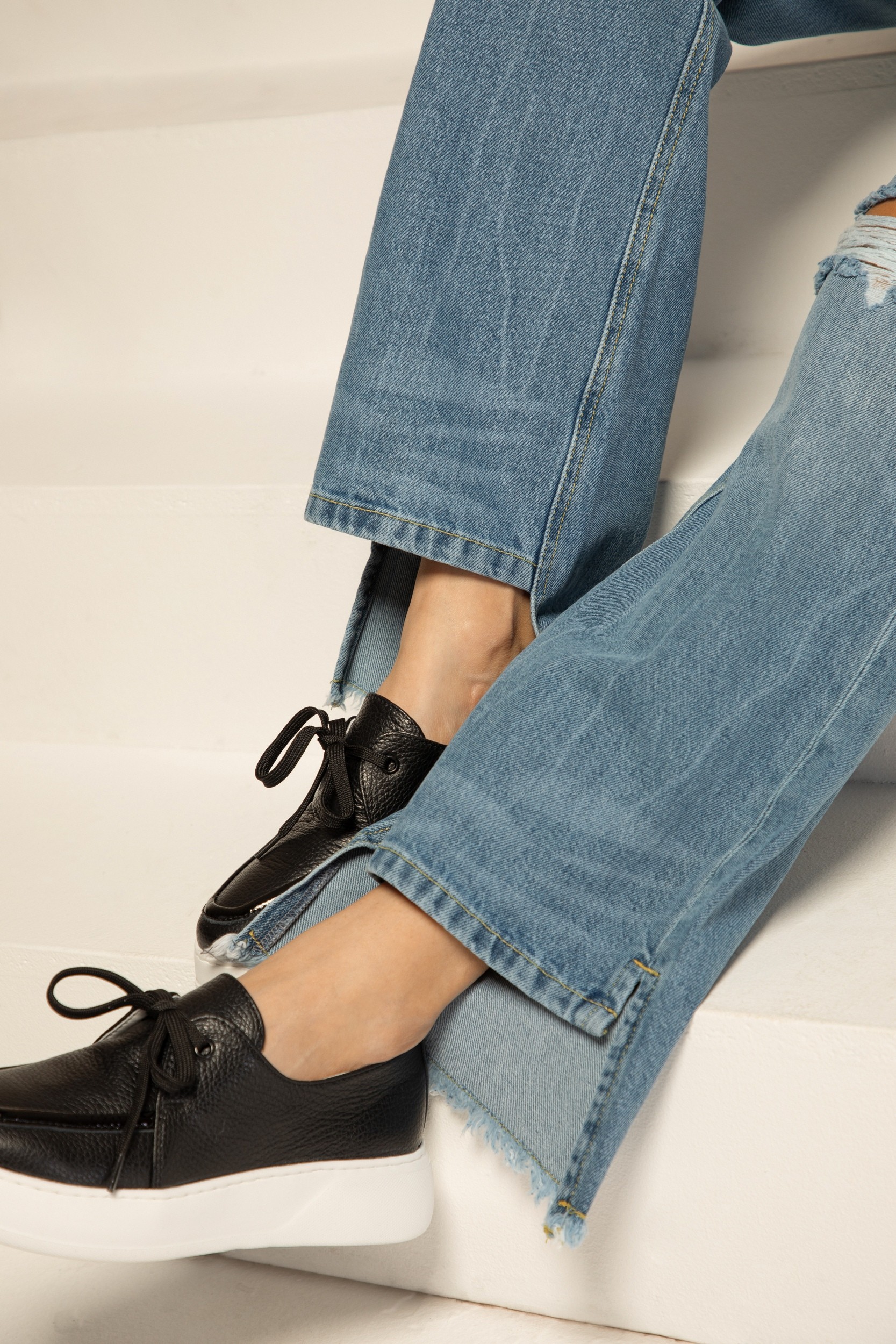 Авангардни и интересни дънки от приятен деним в синьо. Вталена горна част и широк крачол с ръчно направени избелени и разкъсани ефекти. Интересен подгъв с по-къса предна част. Класически предни и задни джобове и закопчаване посредством цип и копче отпред.