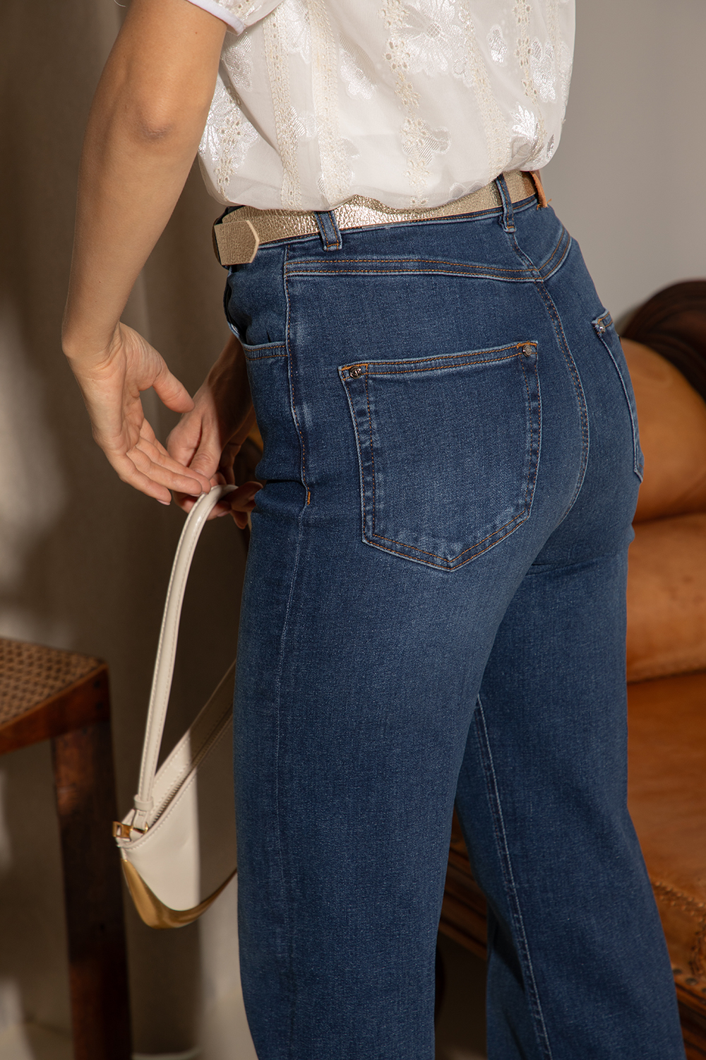 Спортно-елегантни дънки от мек еластичен деним с високо съдържание на памук в тъмен деним. Вталена кройка с издължена линия и широк крачол. Предни и задни джобове. Закопчаване с цип и копче.