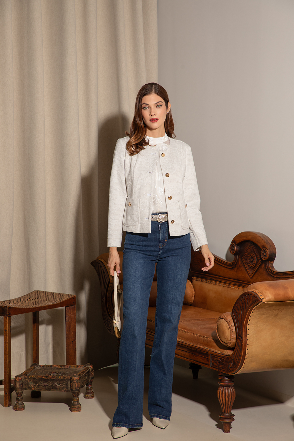 Спортно-елегантни дънки от мек еластичен деним с високо съдържание на памук в тъмен деним. Вталена кройка с издължена линия и широк крачол. Предни и задни джобове. Закопчаване с цип и копче.
