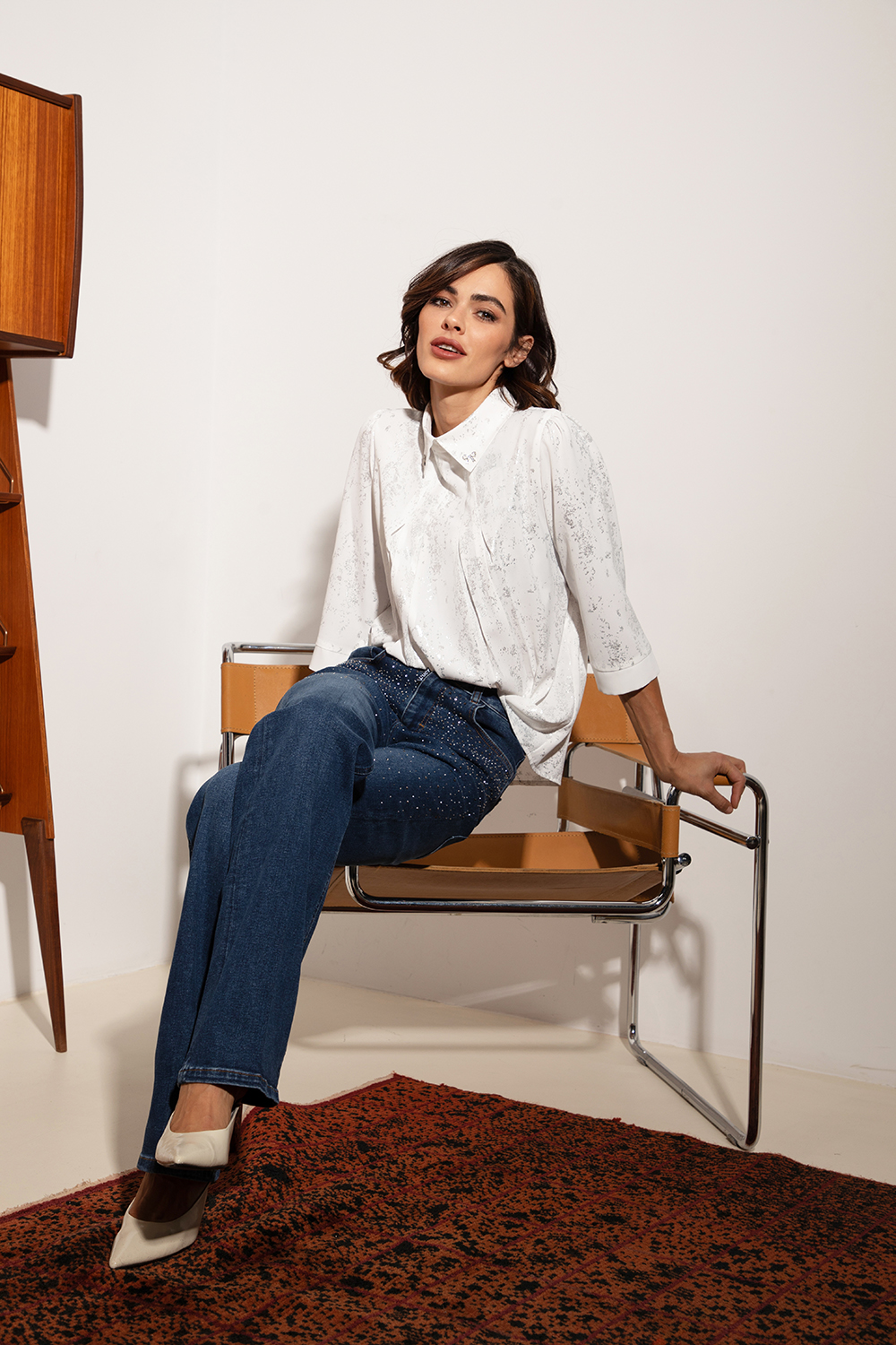 Спортно-елегантни дънки от мек еластичен деним с високо съдържание на памук в тъмно синьо. Вталена кройка с издължена линия и широк крачол. Предни и задни джобове, закопчаване с цип и копче. Ефектни блестящи частици в горната предна част.