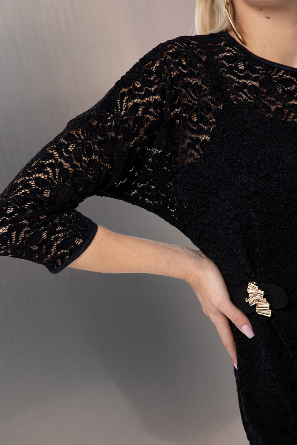 Елегантна рокля от красива еластична дантела в черно. Леко свободен силует със 7/8 прилеп ръкав. Акцент в талията полу коланче със златисто бижу. Роклята се предлага с отделна подплата от еластична материя в черно.