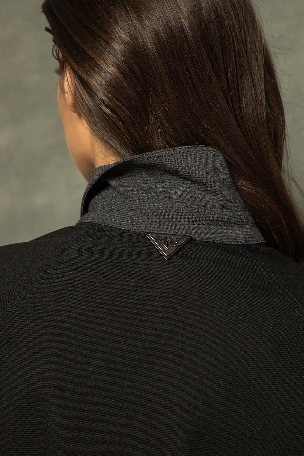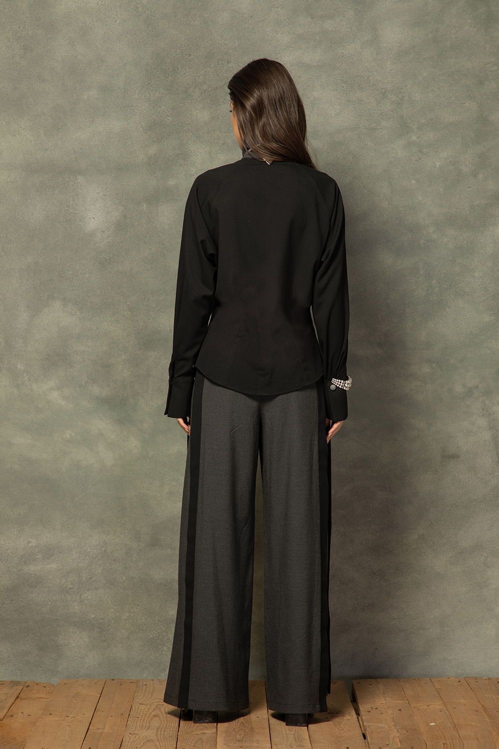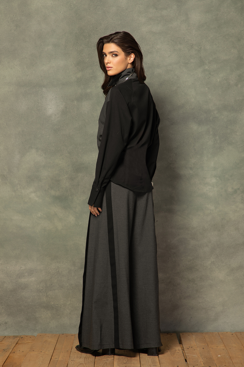 Елегантна риза в комбинация от сиво и черно от приятна еластична материя със съдържание на памук. Леко свободен издълежен силует с вталяван посредством чупки на гърба. Предно закопчаване с пластрон и тик так копчета и яка. Дълъг ръкав с широк маншет.