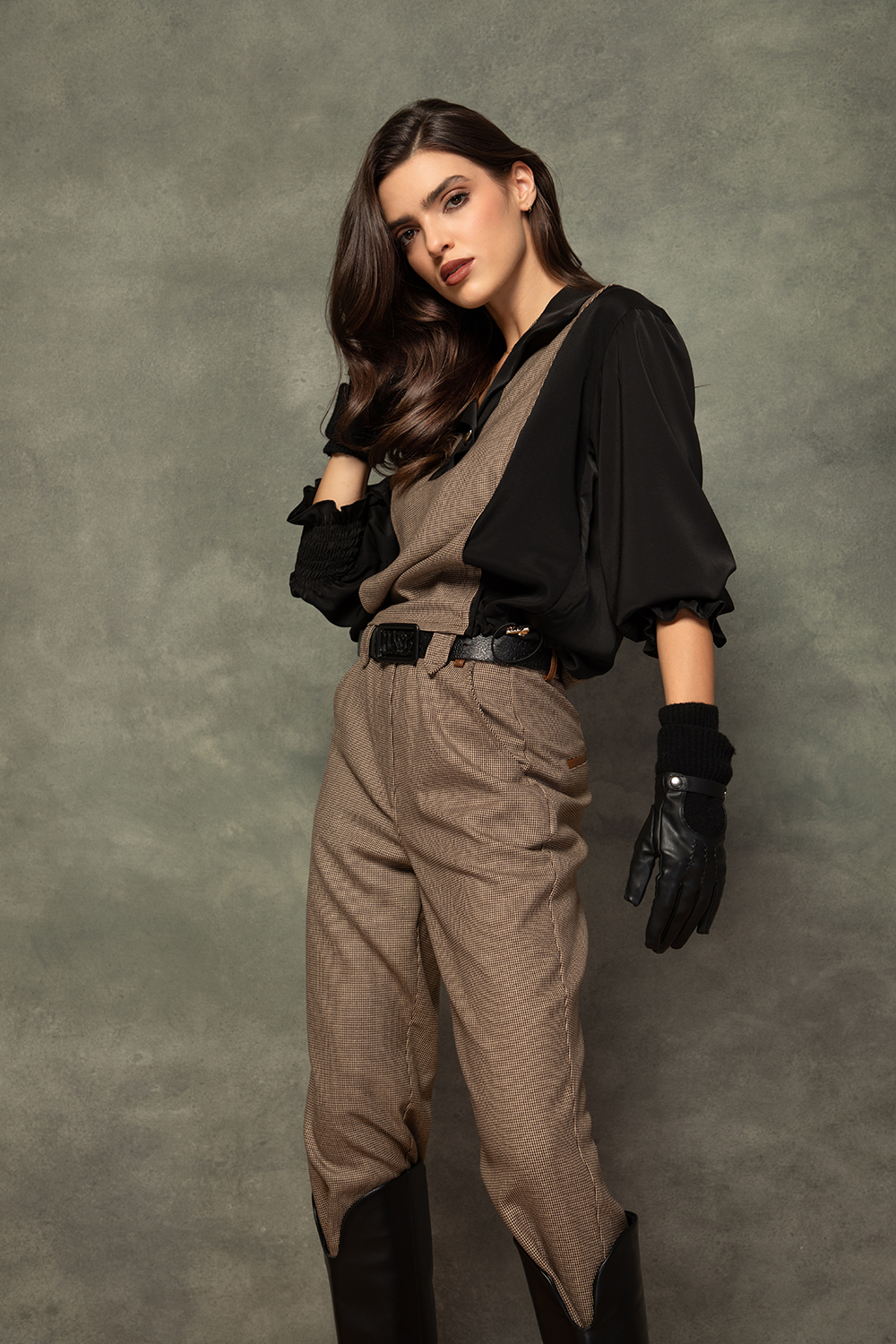 Елегантна риза в комбинация от пепит в бежово кафяво и черно от приятна материя. Леко свободен силует с широк шлиц и яка и регулируем ластик в страничния подгъв. Свободен дълъг ръкав завършен с ластичен маншет.