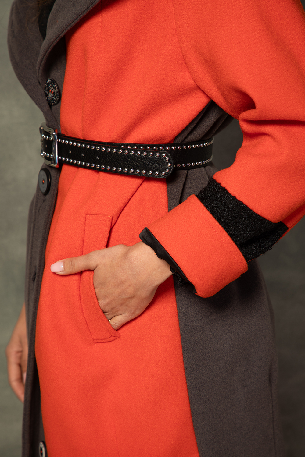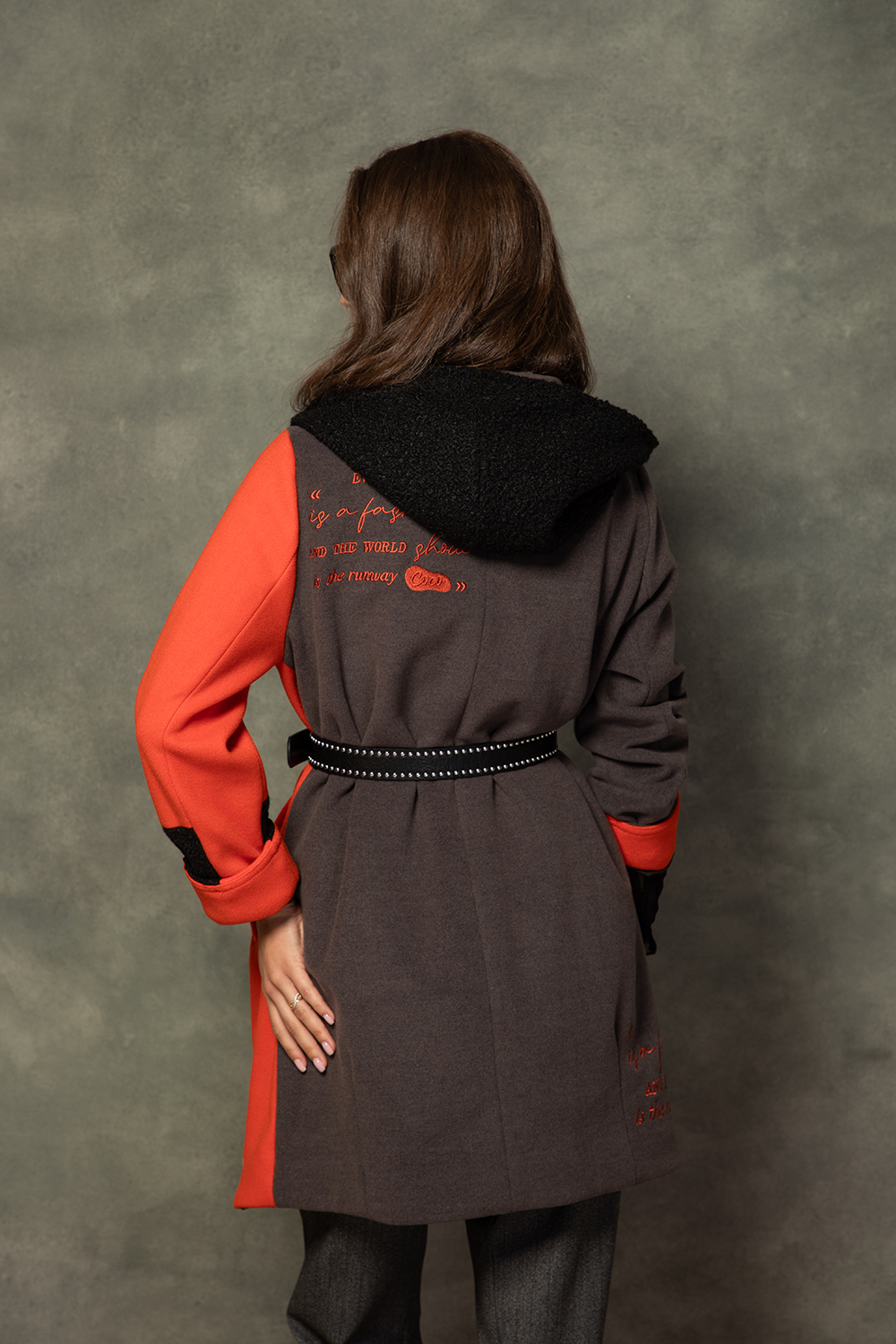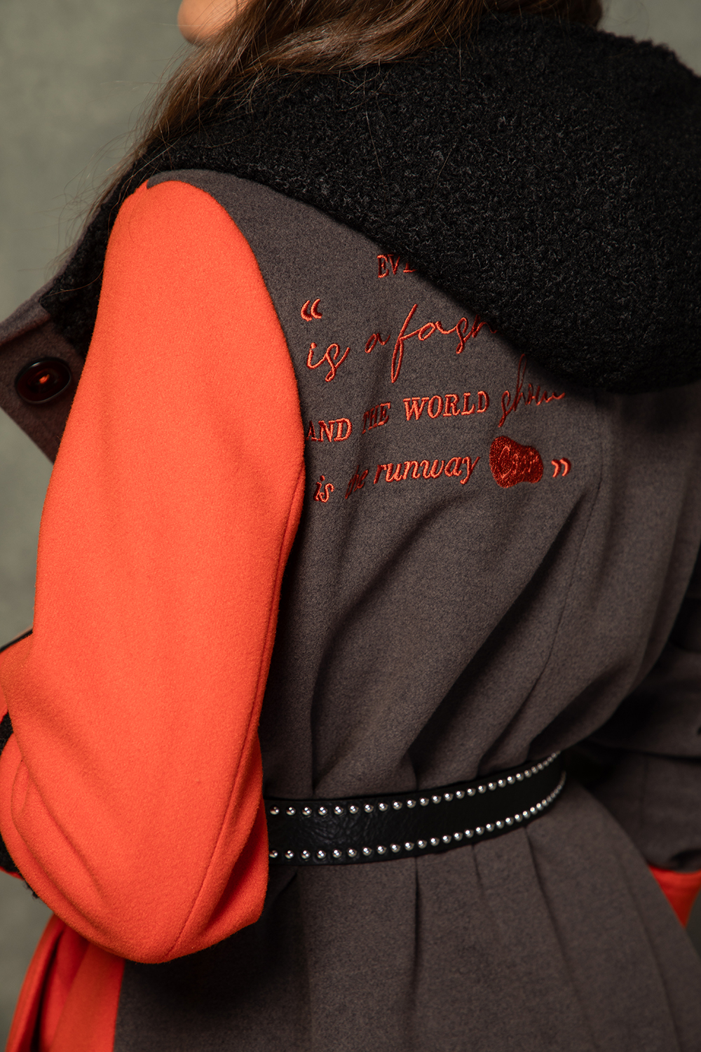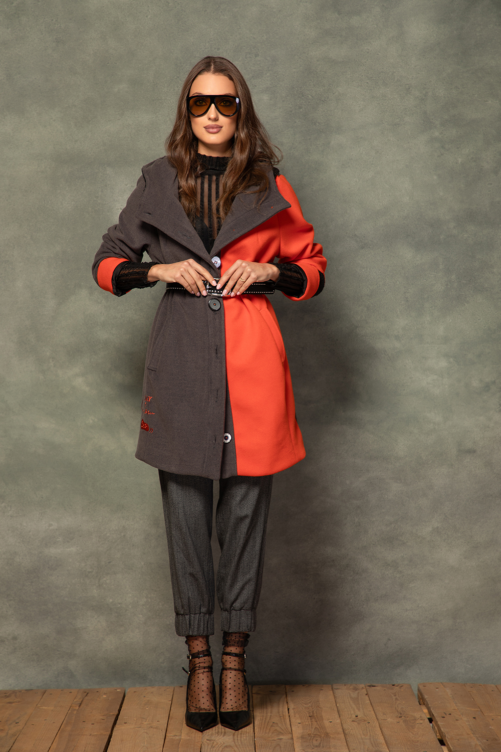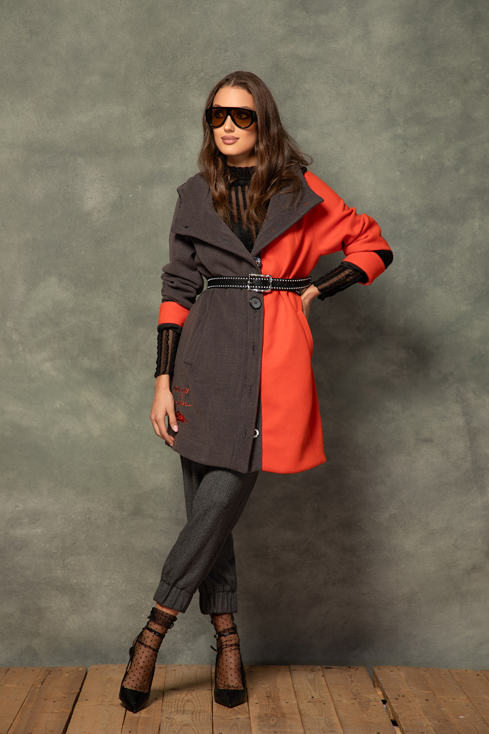 Елегантно двуцветно палто от топла материя със съдържание на вълна. Свежа комбинация от сиво и светло коралово червено с бродирани акценти на гърба и встрани. Издължен леко свободен силует с предно закопчаване посредством ефектни копчета. Дълъг ръкав, качулка и предни джобове. Моделът е с подплата, която на гърба е топъл полар, а предницата е от сатенирана цветна подплата.
