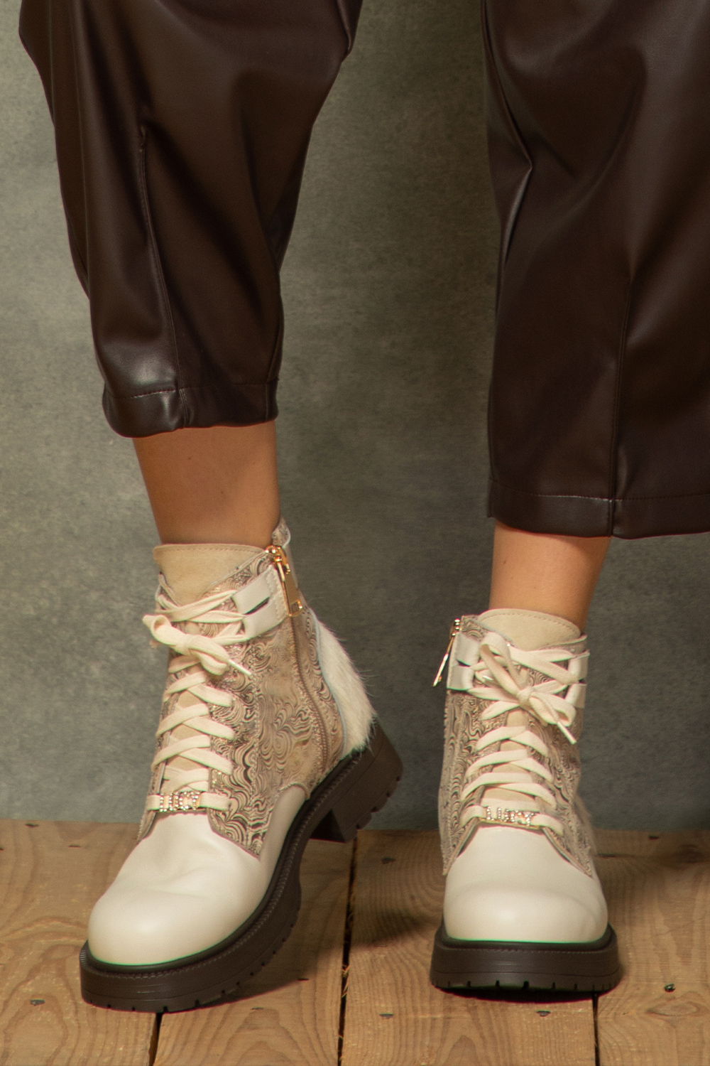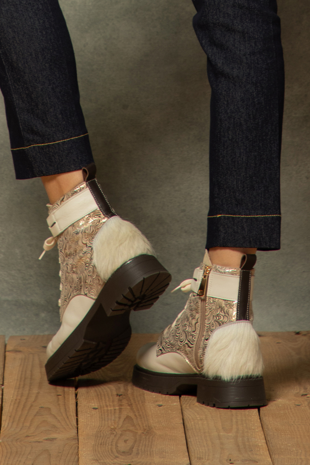 Елегантни боти в цвят ванилия със златисти акценти и детайл от естествен косъм. Закопчаване посредством страничен цип и връзки отпред с комфортна подметка.
