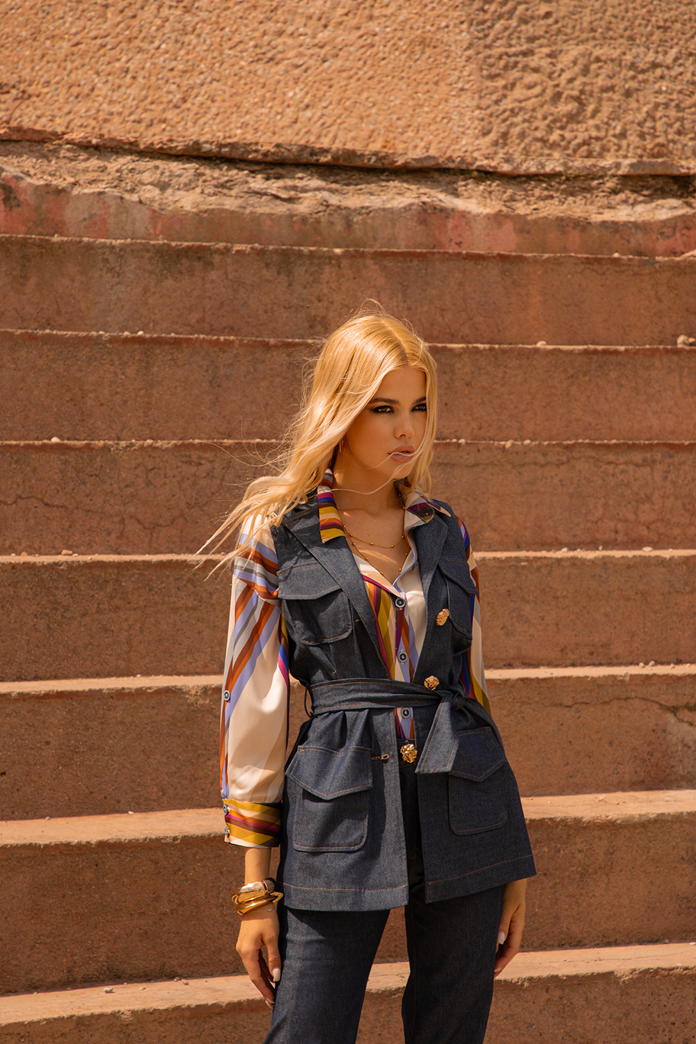 Спортно-елегантен елек от приятен еластичен деним с високо съдържание на памук в цвят индиго. Втален силует и леко издължена линия. Предно закопчаване с ефектни златисти копчета и ревер. Горни и долни външни джобове с капак. Гайки и подвижен колан за допълнително вталяване.