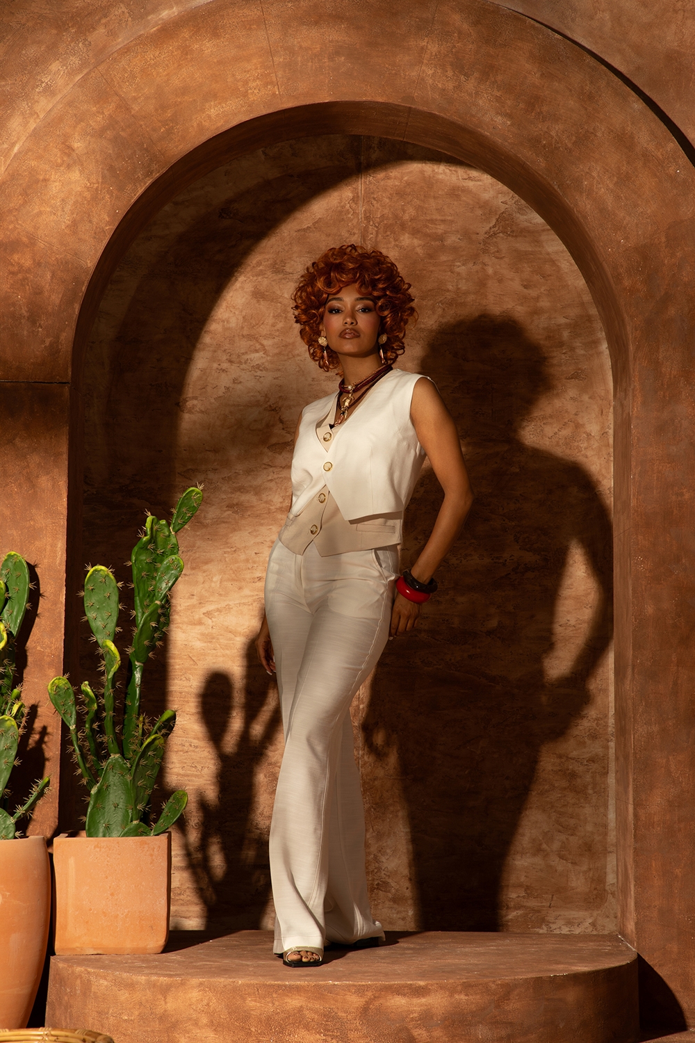 Спортно-елегантен елек от приятна материя смес от лен и вискоза в комбинация от бяло и бежово. Леко свободен скъсен силует с интересна кройка - двойна предница. V-образно деколте и декоративни филетки. Предно закопчаване посредством копчета.