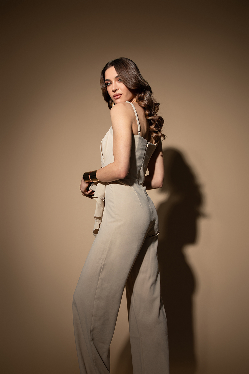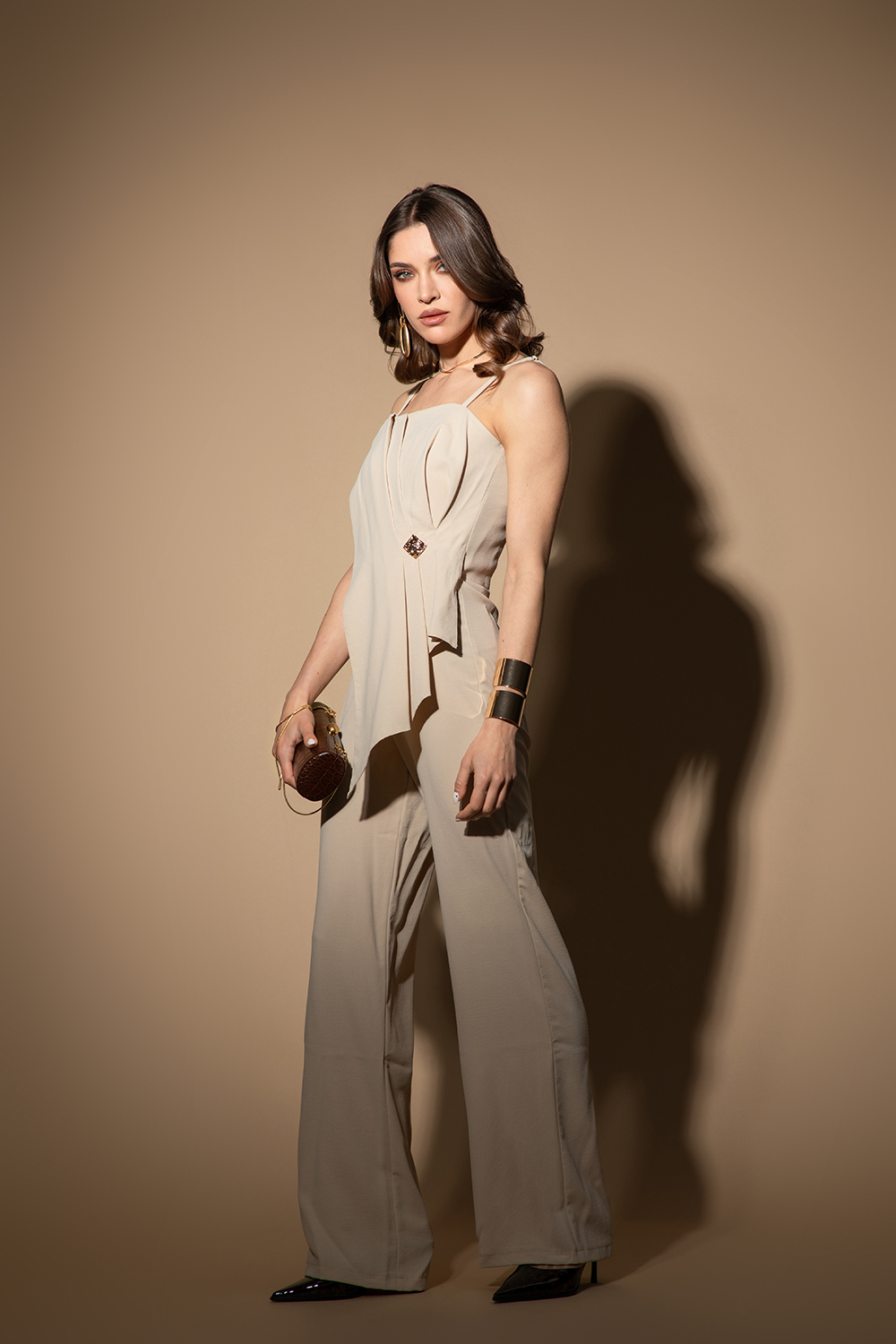 Елегантен гащеризон от лека еластична материя в млечно бежово. Втален силует със стилен асиметричен детайл с плисета. Регулируеми тънки презрамки и закопчаване посредством скрит цип на гърба.