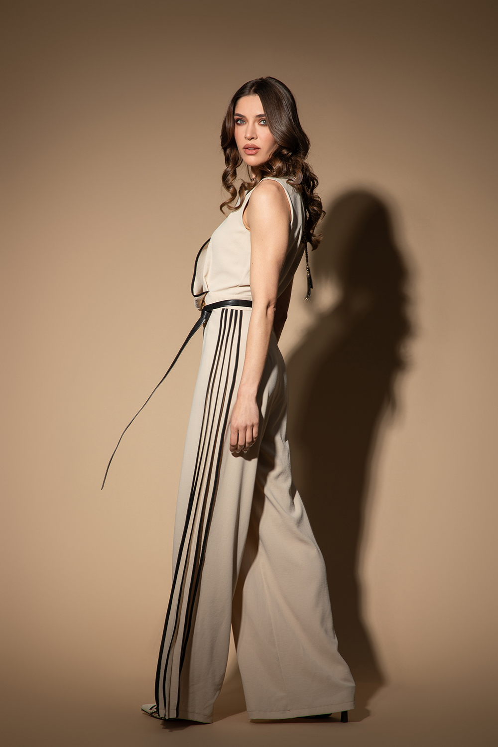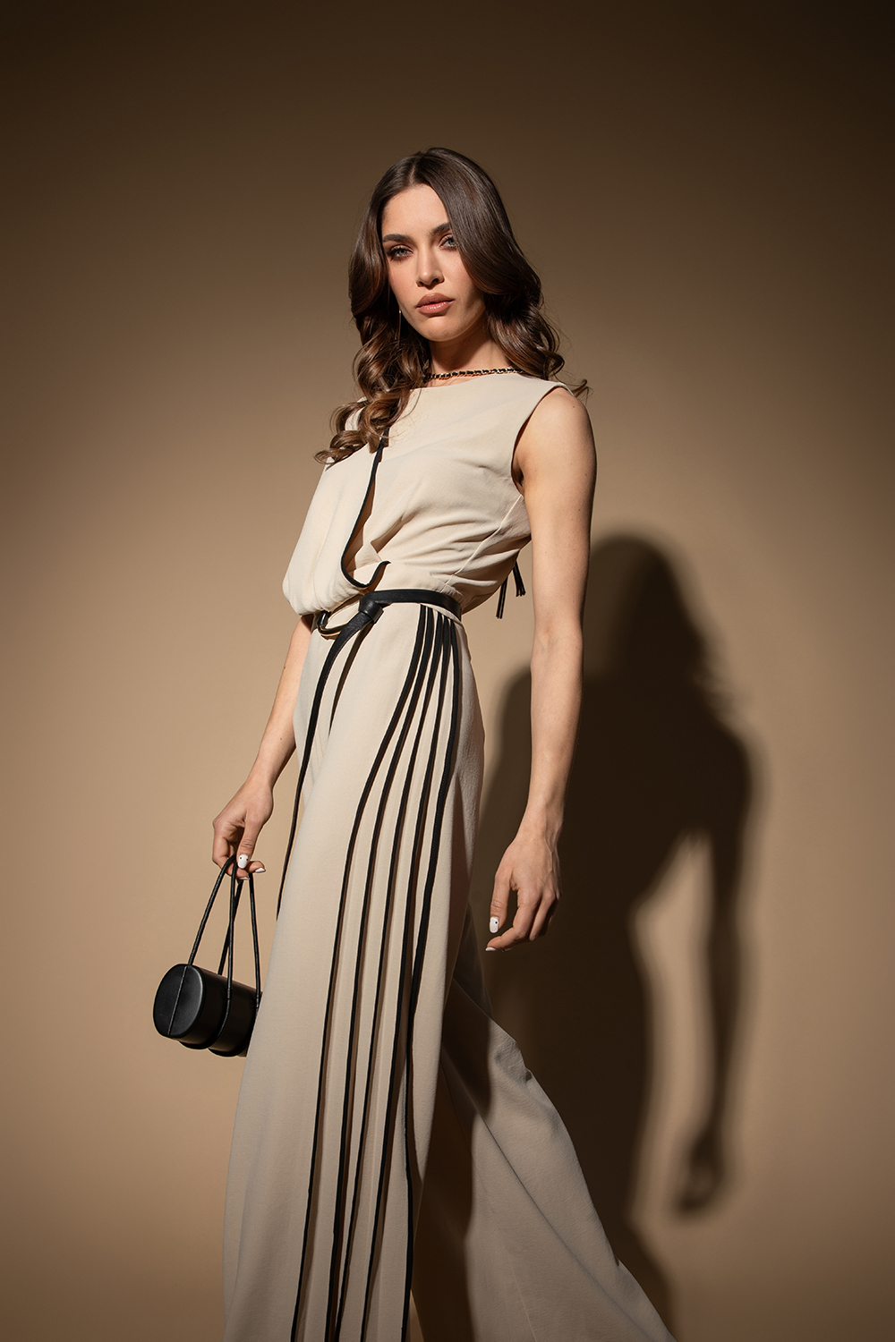 Елегантен гащеризон от приятна тежко падаща материя в светло бежово. Леко втален силует със свободна горна част и разкроен крачол на панталона. Обло деколте, асиметрично прехвърлена предница и кантове на крачола обточени с черно бие. Закопчаване посредством цип и копче на гърба.