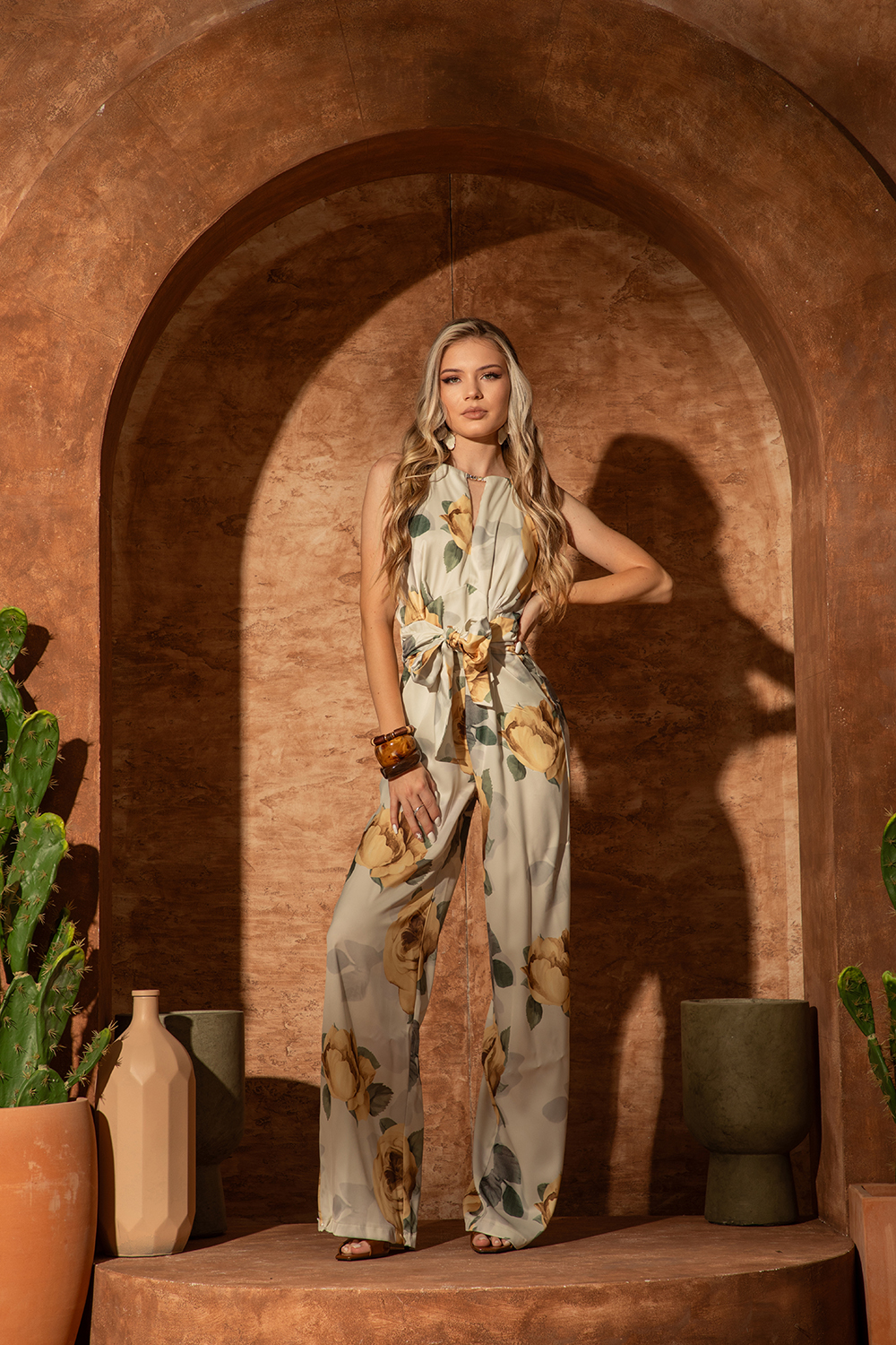 Елегантен гащеризон от лека сатенирана материя в красив флорален десен. Ефектна горна част с V-образно деколте и регулируеми презрамки, леко свободен крачол. Интересен отворен гръб и закопчаване посредством скрит цип. Гащеризона е с фиксиран колан, който може да се оформи като панделка.