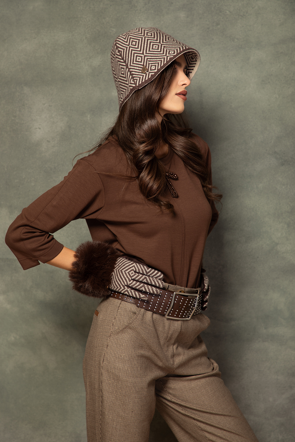 Спортно-елегантна блуза в шоколадово кафяво от приятно еластично трико. Свободен силует с обло деколте и 7/8 ръкав. Ефектна декоративна панделка в предната част.