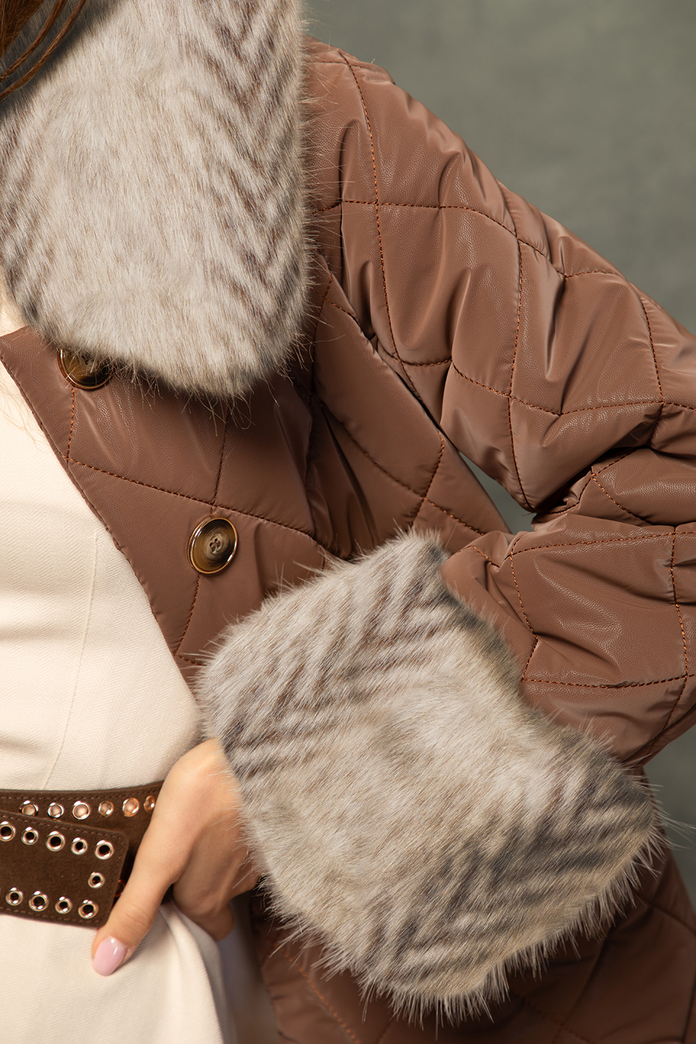 Елегантно ватирано яке в шоколадово кафяво в комбинация с яка и маншети от еко косъм. Леко втален силует с предно закопчаване посредством копчета и джобове. Моделът е изработен от промазана матова материя капитонирана с вата и лека подплата.