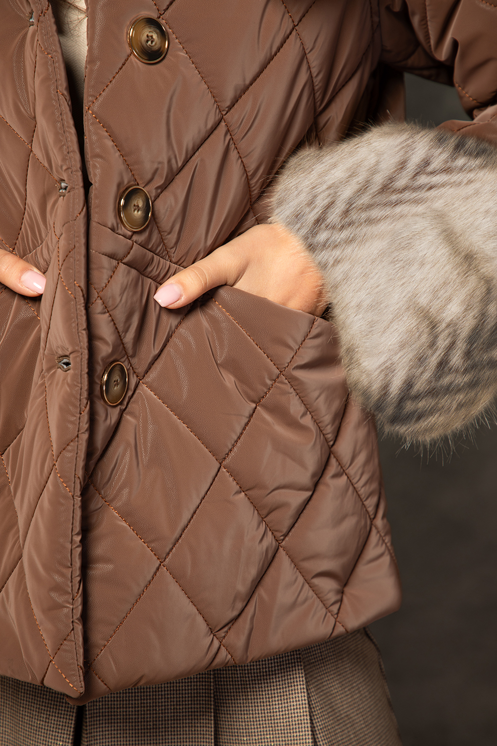 Елегантно ватирано яке в шоколадово кафяво в комбинация с яка и маншети от еко косъм. Леко втален силует с предно закопчаване посредством копчета и джобове. Моделът е изработен от промазана матова материя капитонирана с вата и лека подплата.