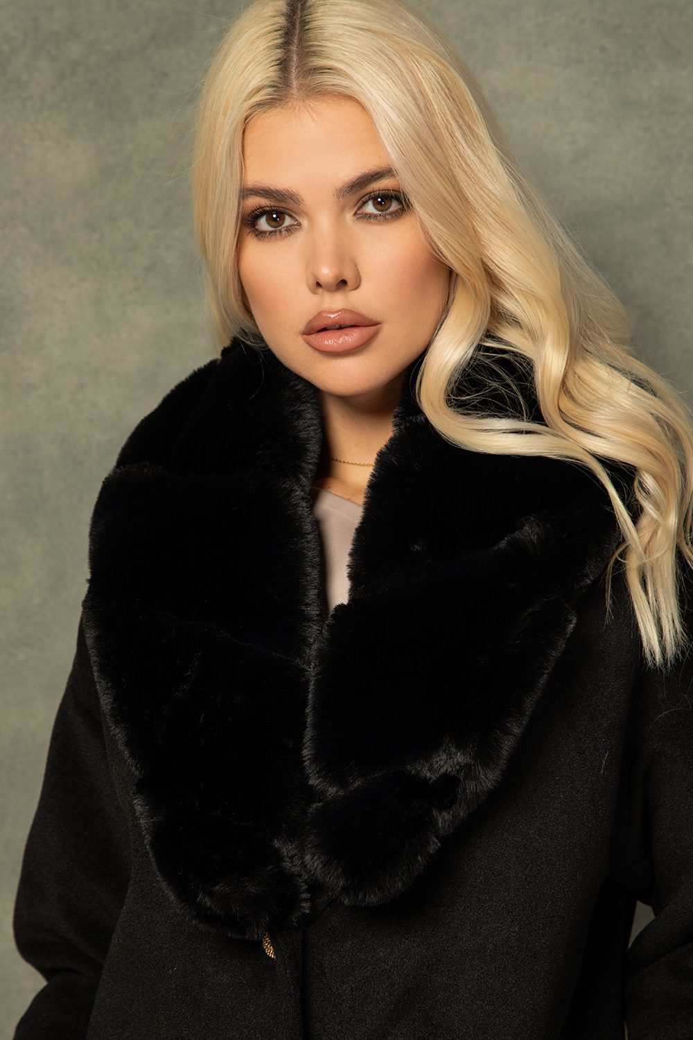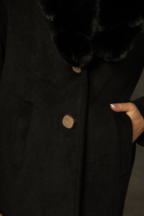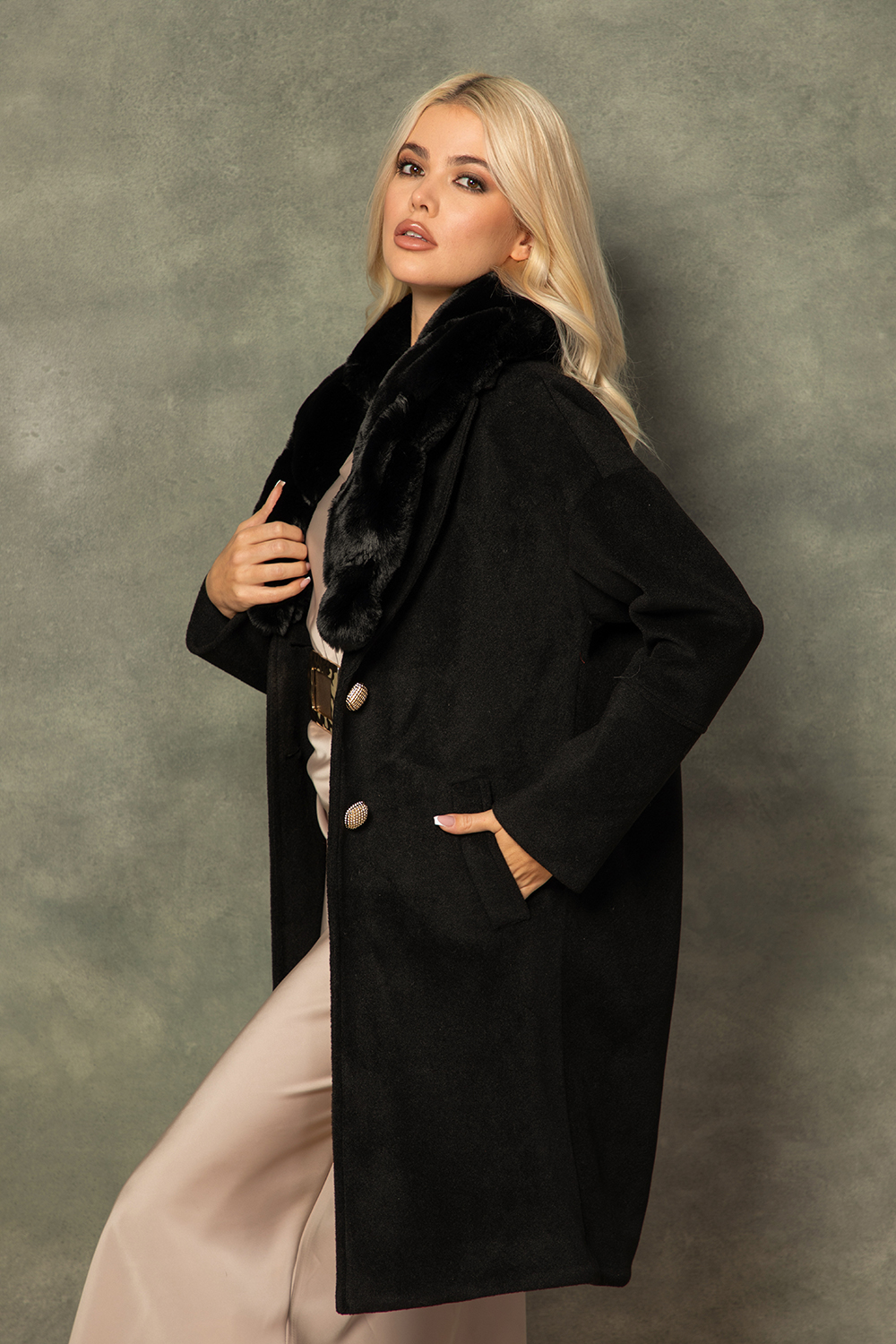 Елегантно палто в черно от красив еко кашмир. Леко свободен силует с издължена линия. Джобове и разкошна подвижна яка от еко косъм. Палтото е изработено със сатенирана подплата в червено.