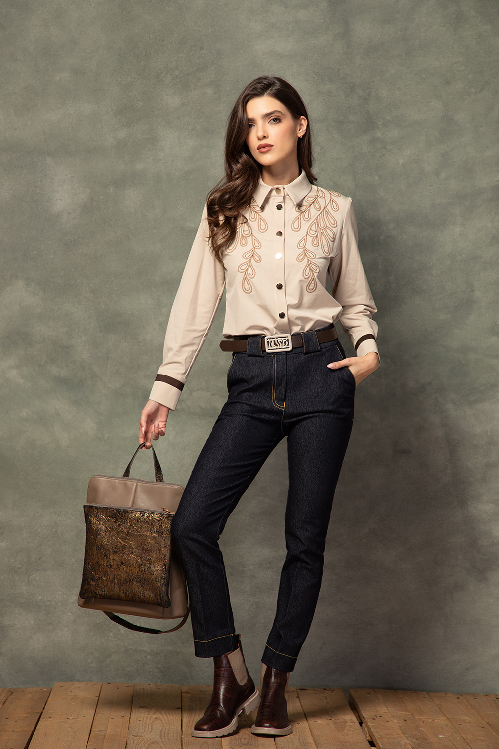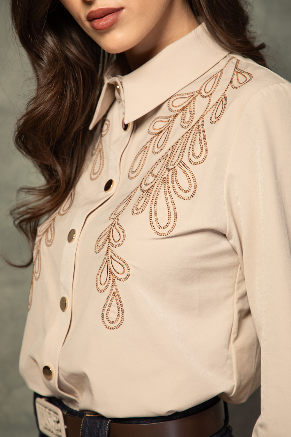 Елегантна класическа риза от приятна еластична материя с високо съдържание на памук в светло бежово. Леко свободен силует с ефектна бродерия на предницата. Закопчаване посредством пластрон с тик так копчета и яка. Дълъг ръкав с маншет.