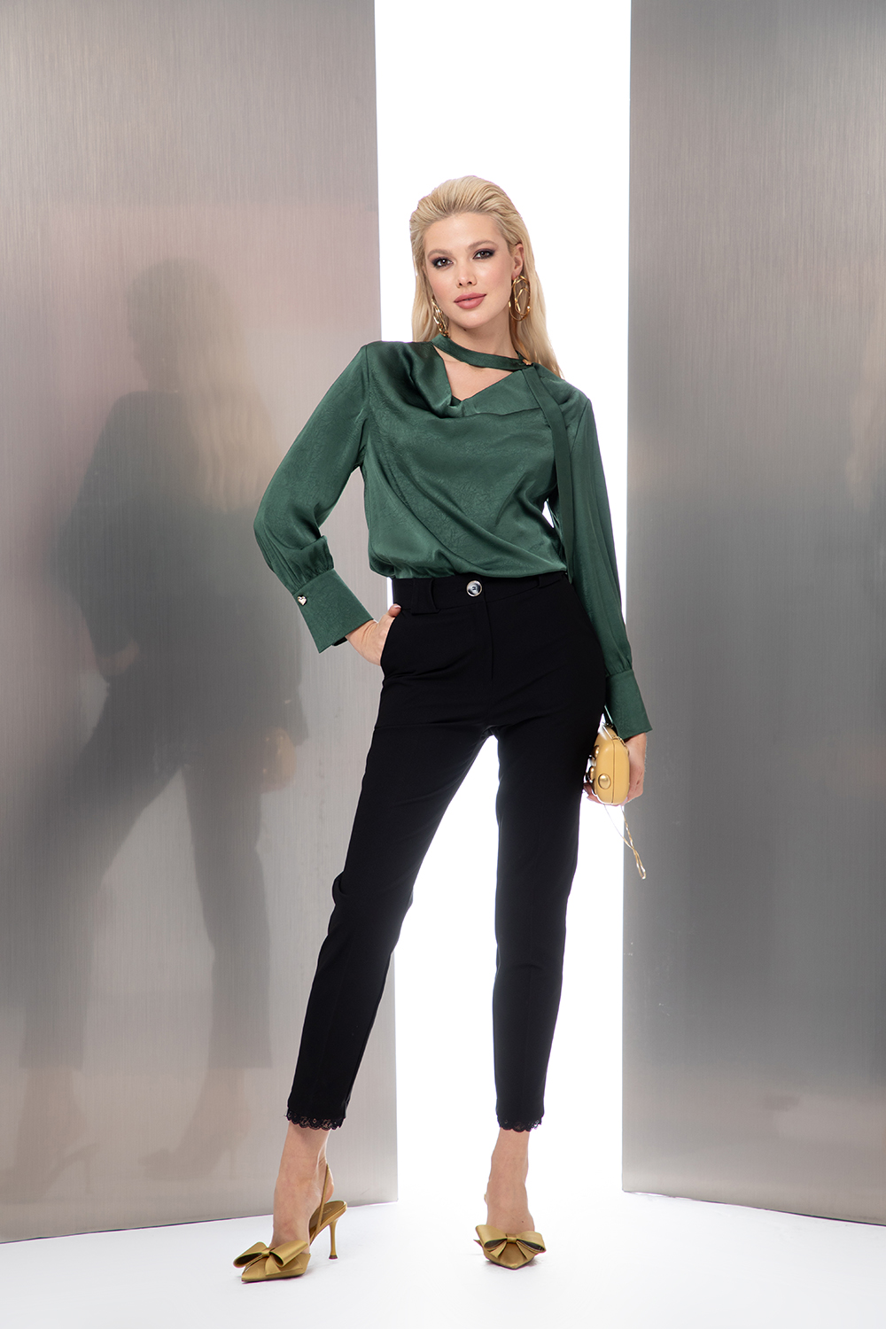 Елегантен панталон от приятна еластична материя в черно. Леко втален силует с гладен ръб. Колан ластик в задната част и ефектни широки гайки за колан. Джобове и предно закопчаване посредством цип и копче. Интересен детайл нежна дантелка в подгъва на крачола.