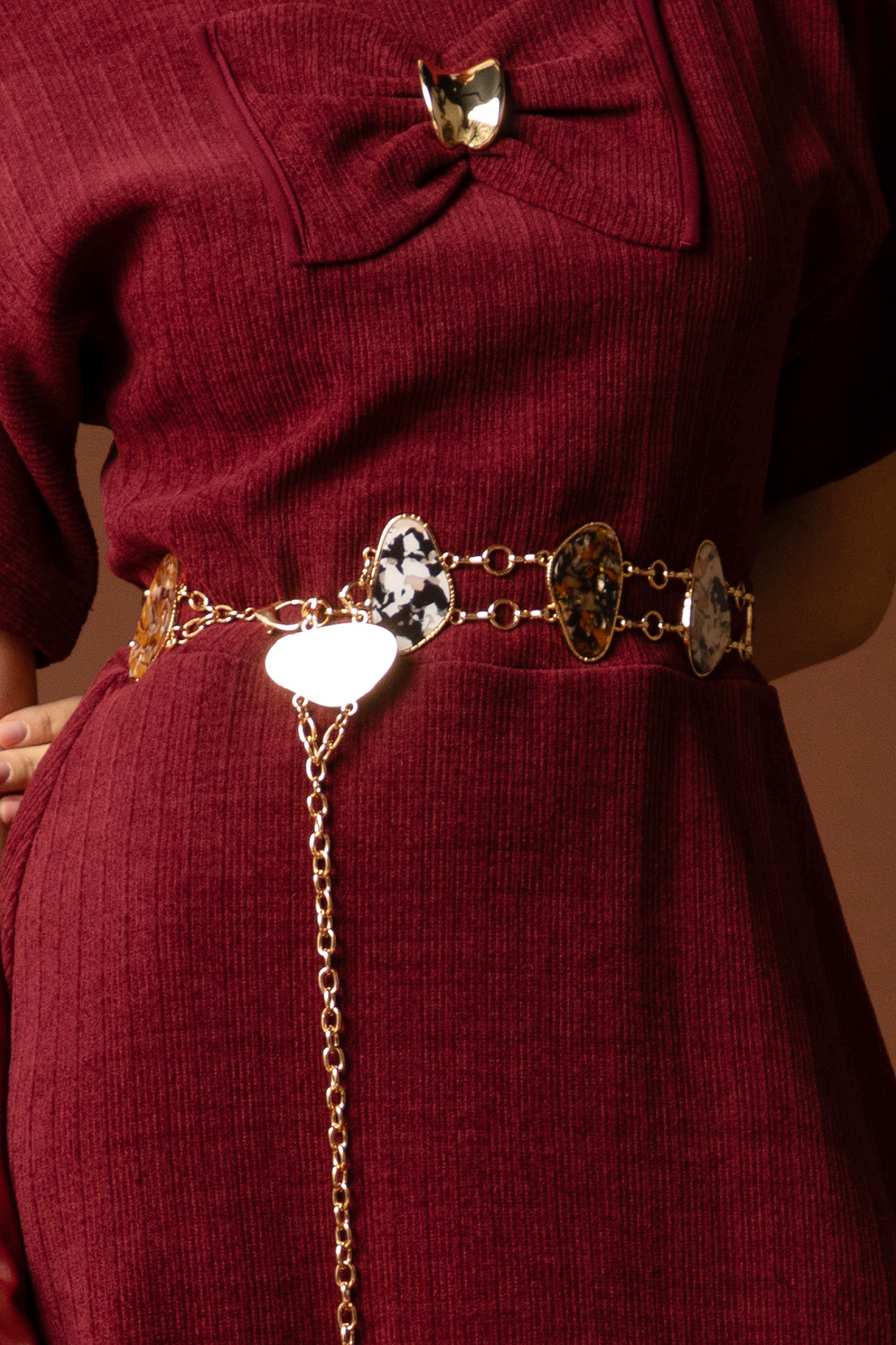 Елегантен колан от двойна златиста верижка с синтетични камъни с различен десен. Може да се закопчее според индивидуалните желания.