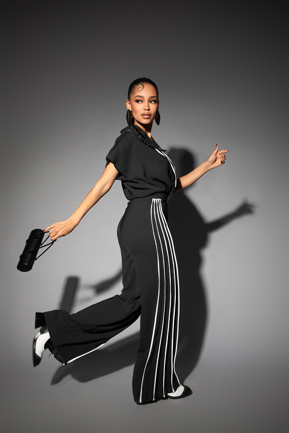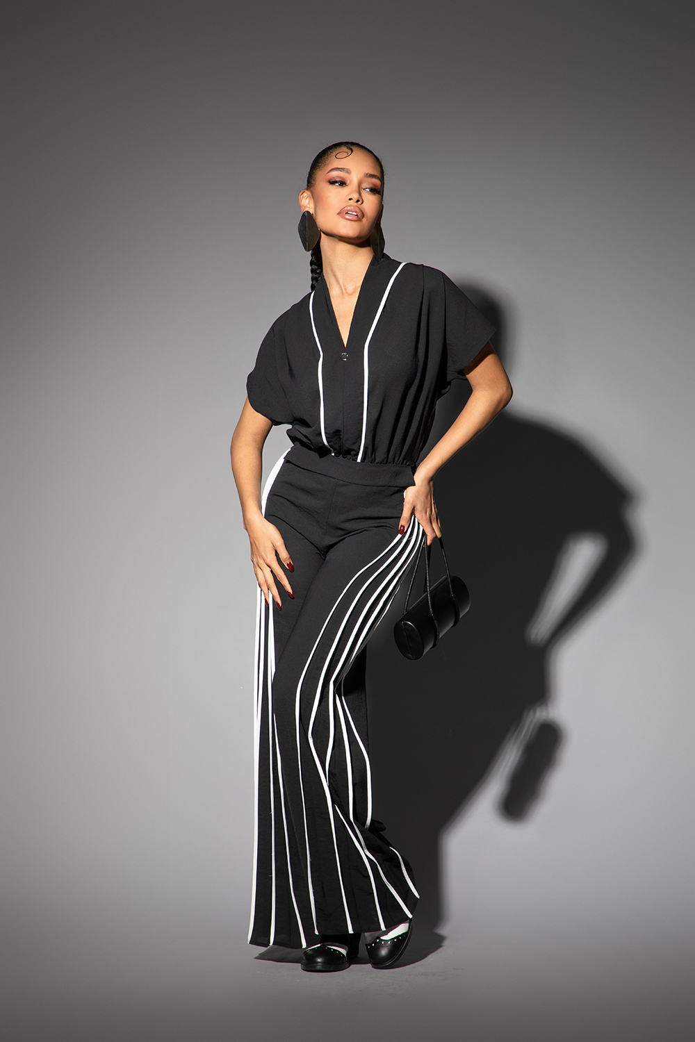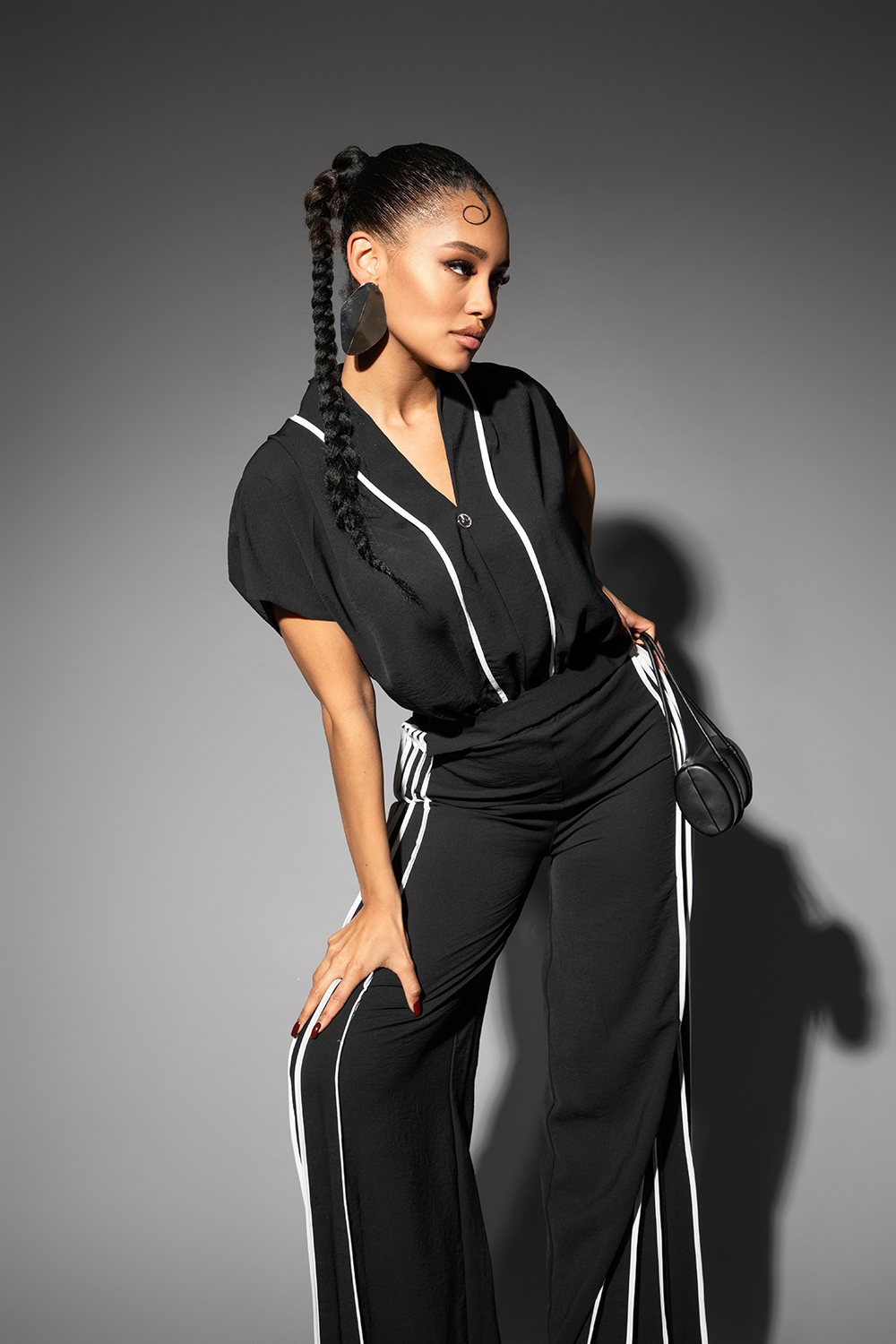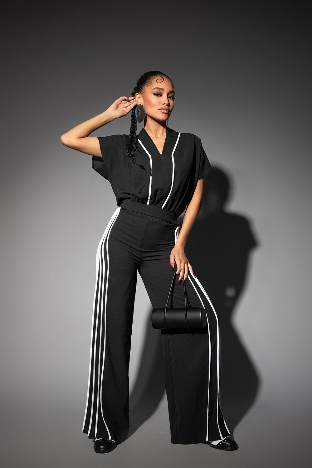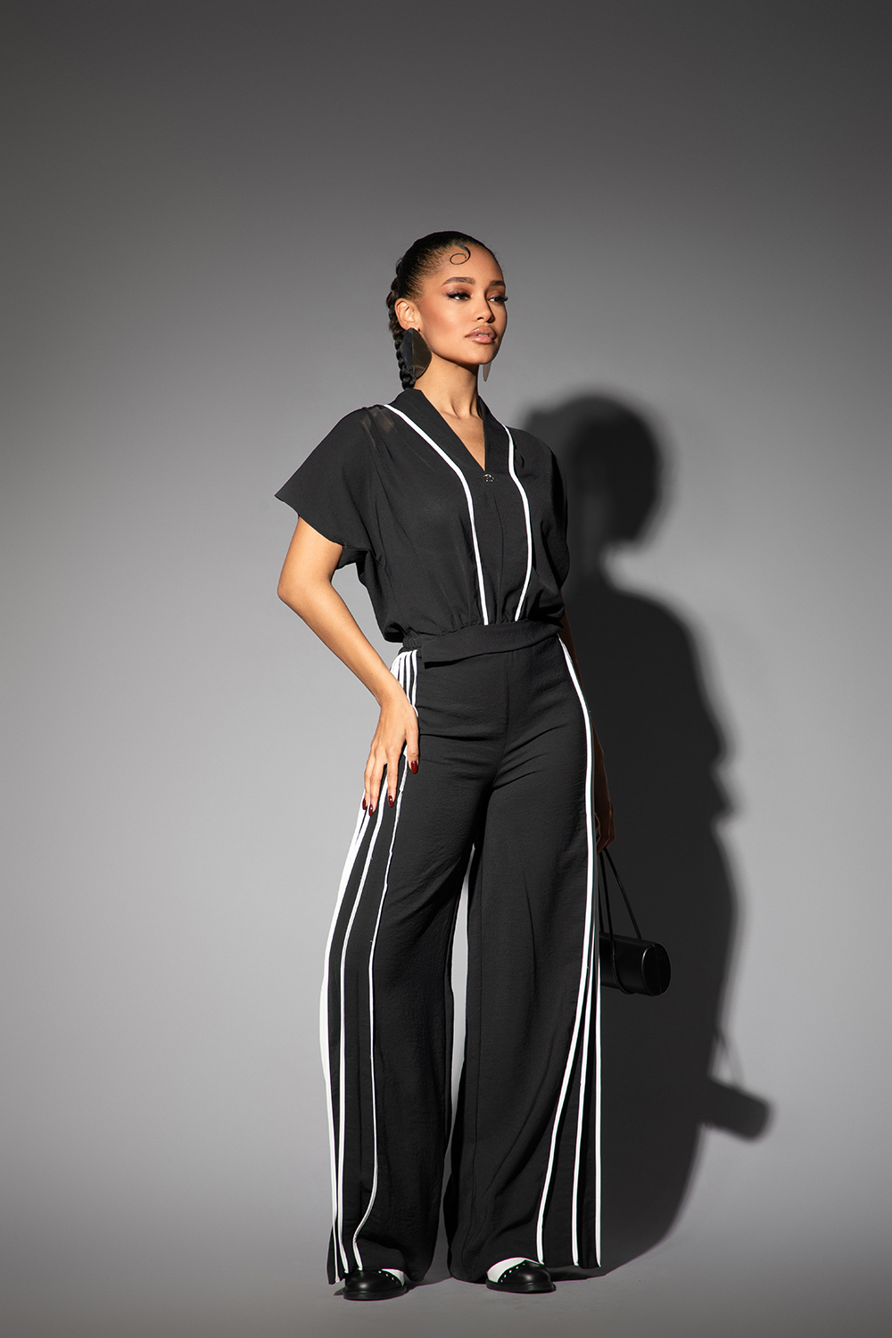 Ефектен елегантен сет в две части, изработен от лека приятна материя в черно. Горната част е свободна блуза с леко скъсен силует. V-образно деколте и декоративни бели биета в предната част. Къс ръкав тип "прилеп" и колан с ластик в задната част. Панталона е с колан ластик в талията и разкроен крачол с ефектни кантове от бяло бие.