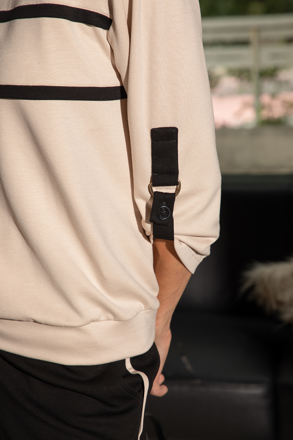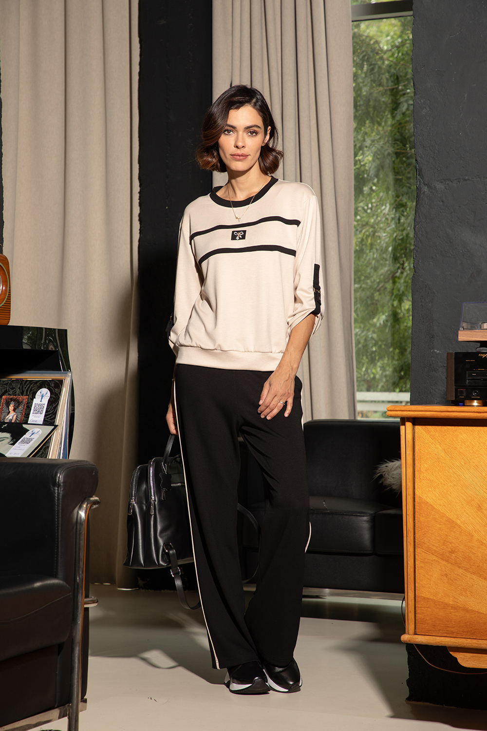 Спортен сет в две части от приятно еластично трико. Блузата е с доста свободна кройка в светло бежово с обло деколте и 7/8 ръкав с щрифелка. Долната част е свободен панталон в черно с колан ластик в талията. Джобове и кант встрани.