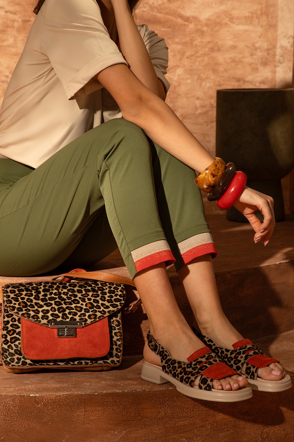 Спортен комплект от две части, комбинация от бежово и цвят каки. Горната част е блуза със свободен силует в бежово с авторски бродерия от еластично трико. Къс ръкав и обло деколте с цветен щрик. Долната част е леко втален панталон в цвят каки. Талията е с колан-ластик в задната част, странични джобове и цветен щрик на крачола.