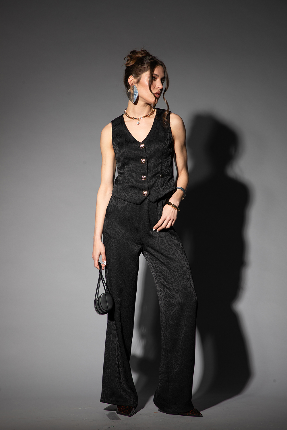 Елегантен комплект в две части от приятна сатенирана вискоза с анималистичен принт в черно. Горната част е елек с вталена кройка. V-образно деколте и предно закопчаване. Панталона е свободен с широк крачол, колан ластик и джобове.
