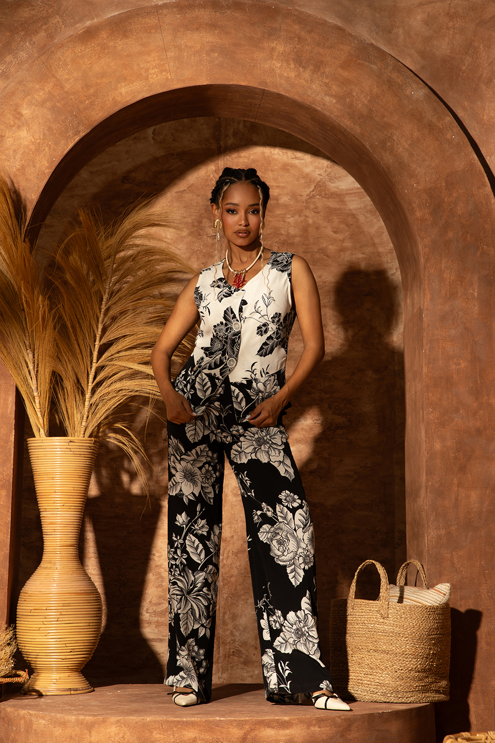 Елегантен сет от две части в ефектен черно бял десен, изработен от приятна вискоза. Горната част е елек с втален силует и предно закопчаване с копчета. Панталона е със свободна кройка и широк крачол. Колан-ластик в талията и джобове.