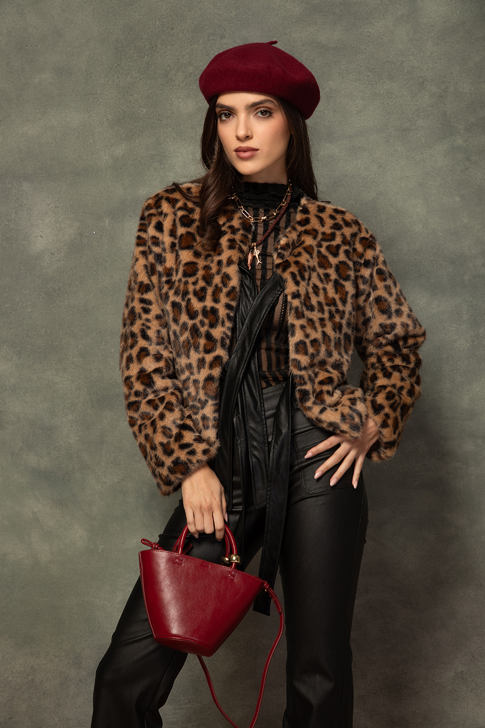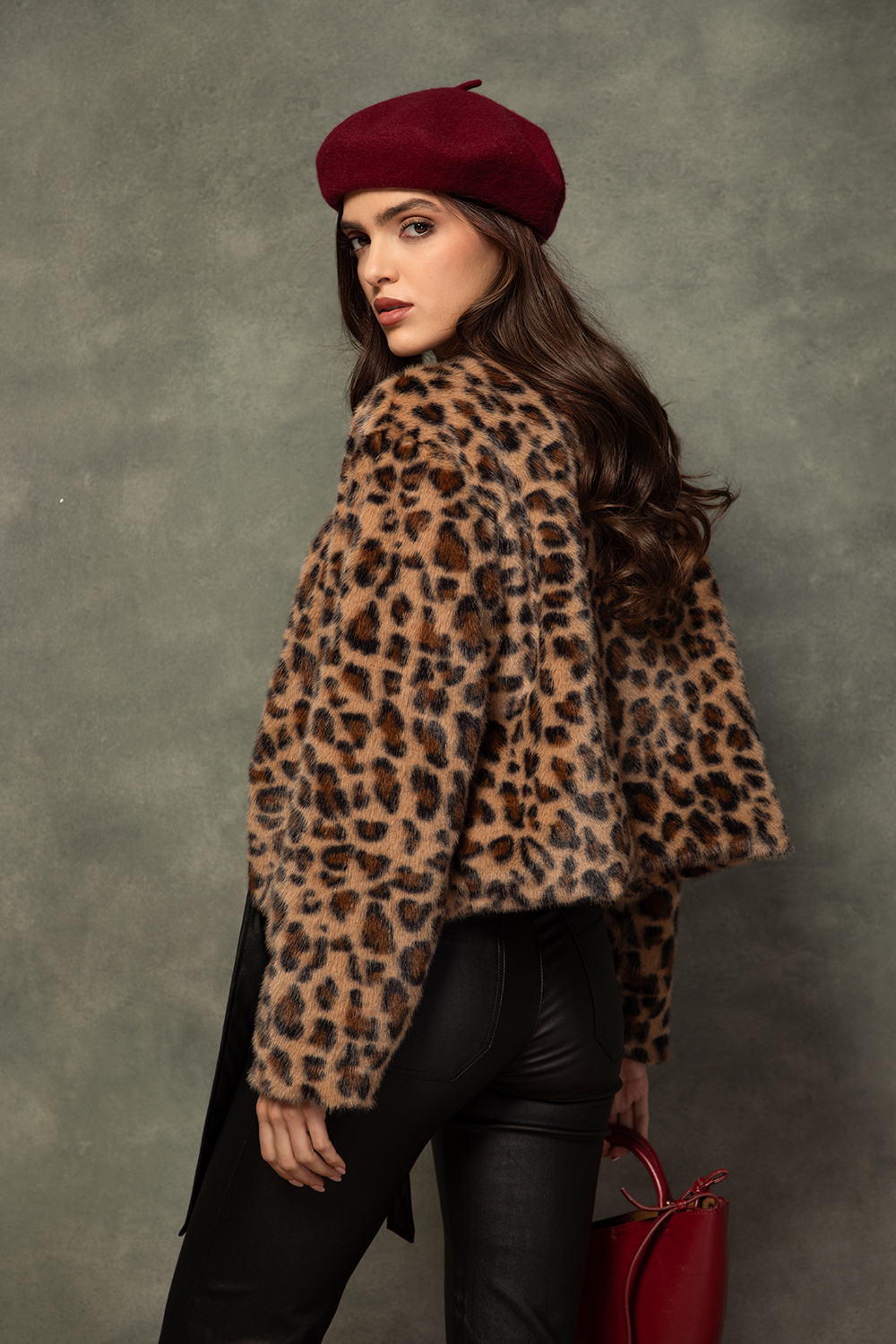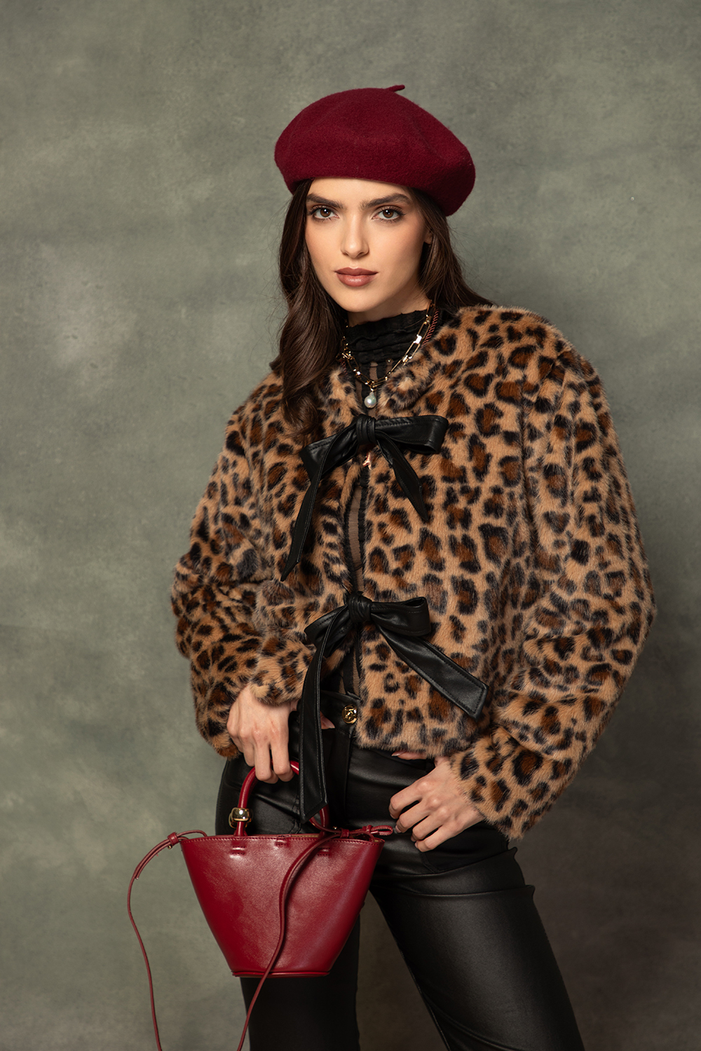 Късо палто бомбър от мек еко косъм в животински принт. Свободен силует с дълъг ръкав. В предната част се завързва с две кожени панделки в черно. Моделът е подплатен с лек хастар.