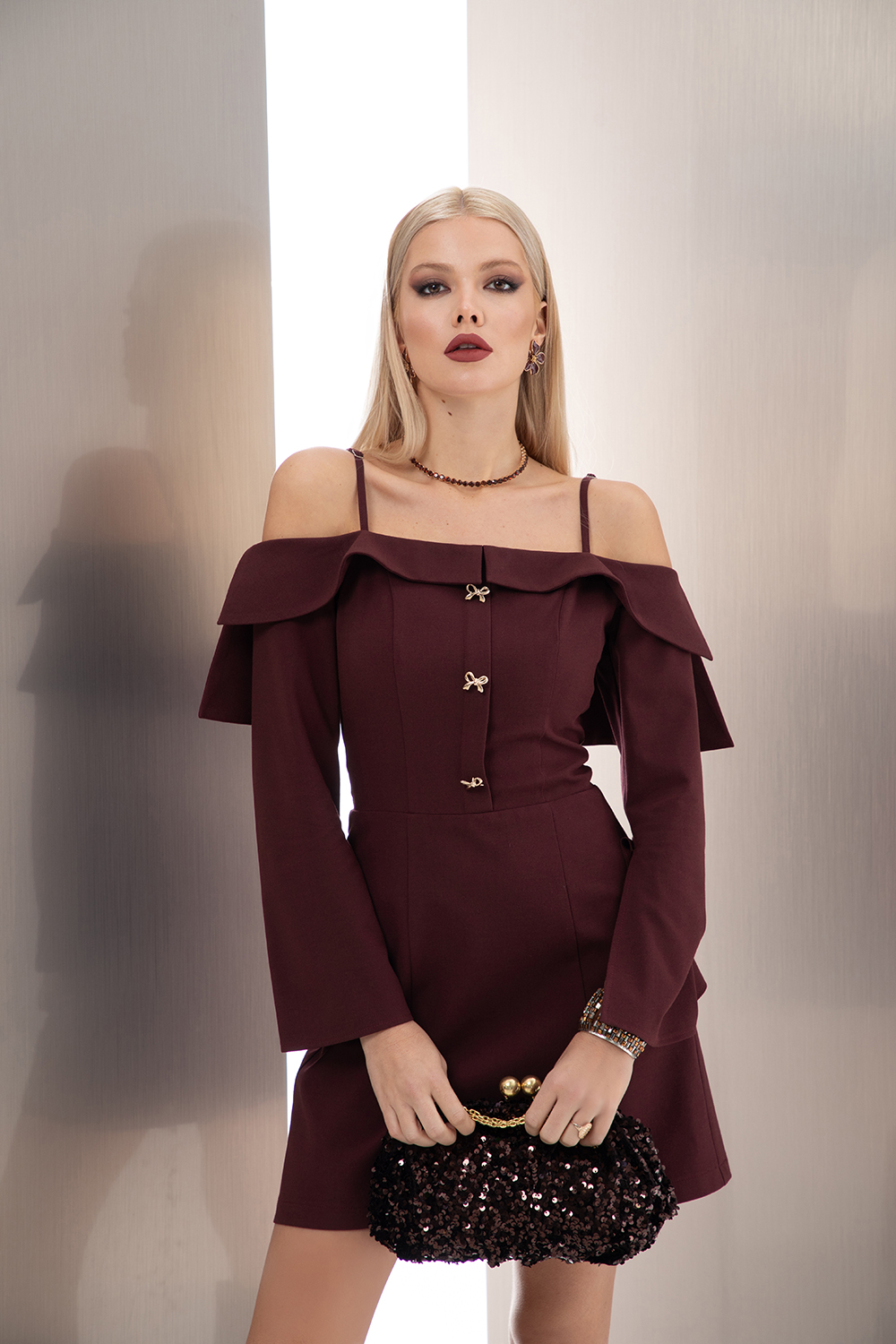 Елегнатна рокля в бордо от приятна еластична материя. Втален силует и интересна кройка с отворени рамене, презрамки и яка. Декоративни златисти панделки на предницата, дълъг клош ръкав с цепка. Задно закопчаване посредством скрит цип.