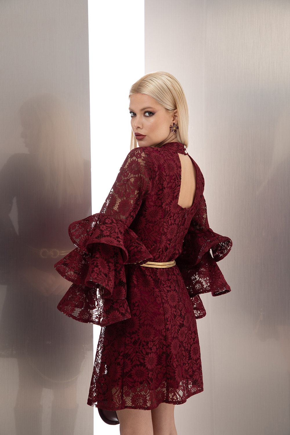 Елегантна рокля от красива дантела в бордо. Леко втален А-силует и ефектни ръкави с разкошни волани. Столче яка и интересен гръб с отвор. Закопчаване посредством цип и копче на гърба. Роклята е подплатена с еластична сатенирана материя.