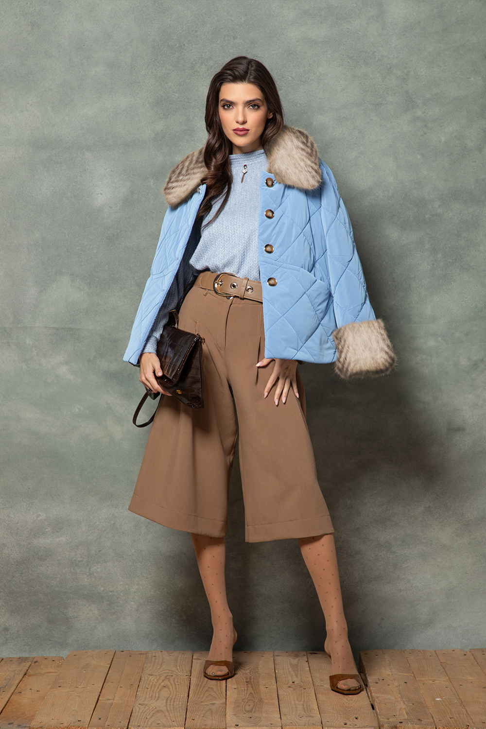 Елегантен пола-панталон в цвят мока от приятна материя със съдържание на памук. Стилен силует с широк крачол, плохи и гайки за колан. Задно закопчаване посредством метален цип.