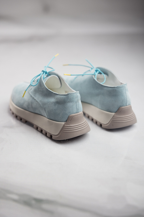 Спортно-елегантни обувки в светло синьо от мек велур с лого на марката и сини връзки.