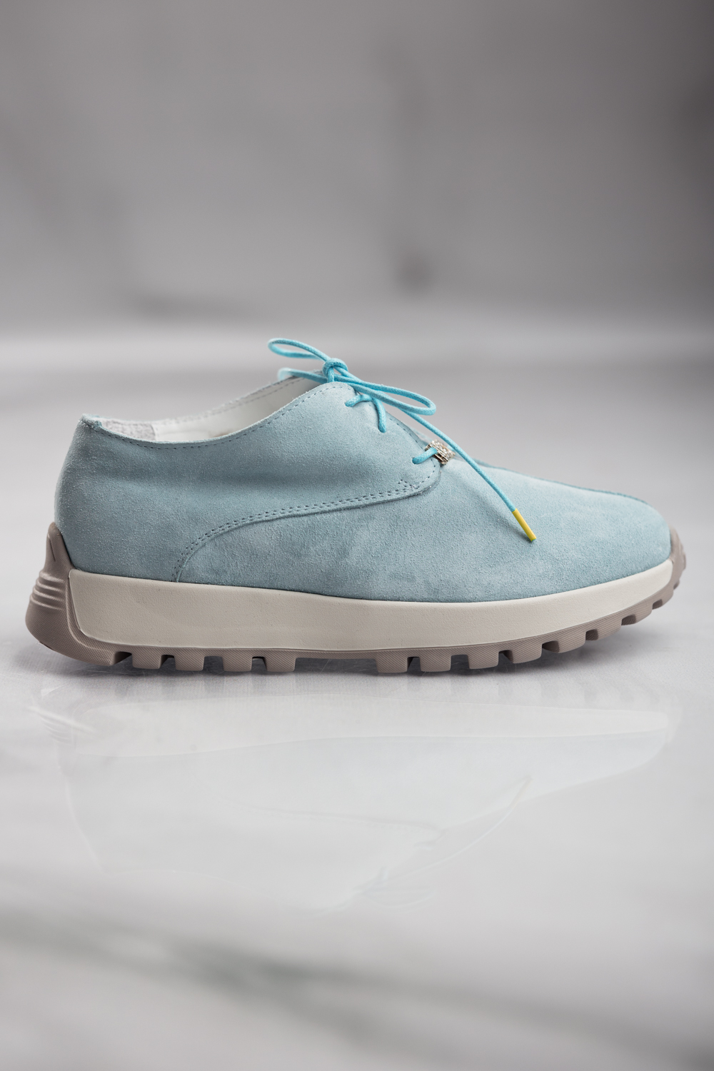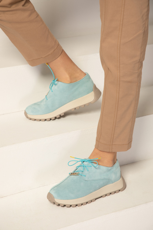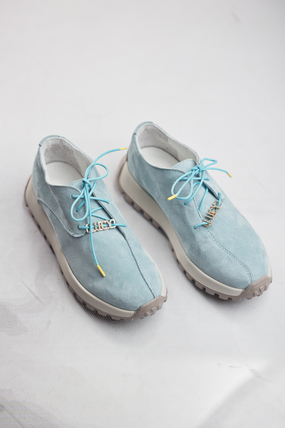 Спортно-елегантни обувки в светло синьо от мек велур с лого на марката и сини връзки.