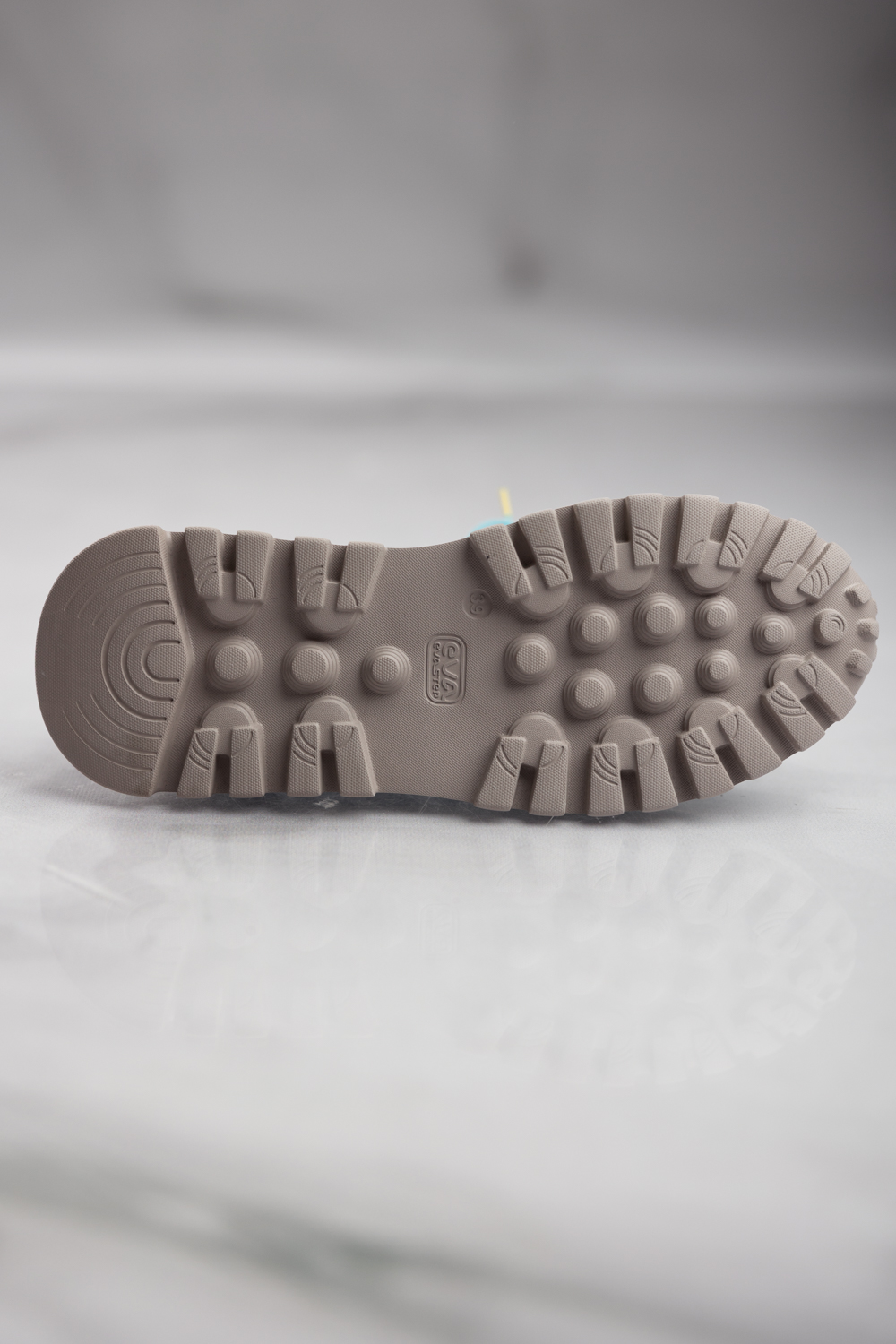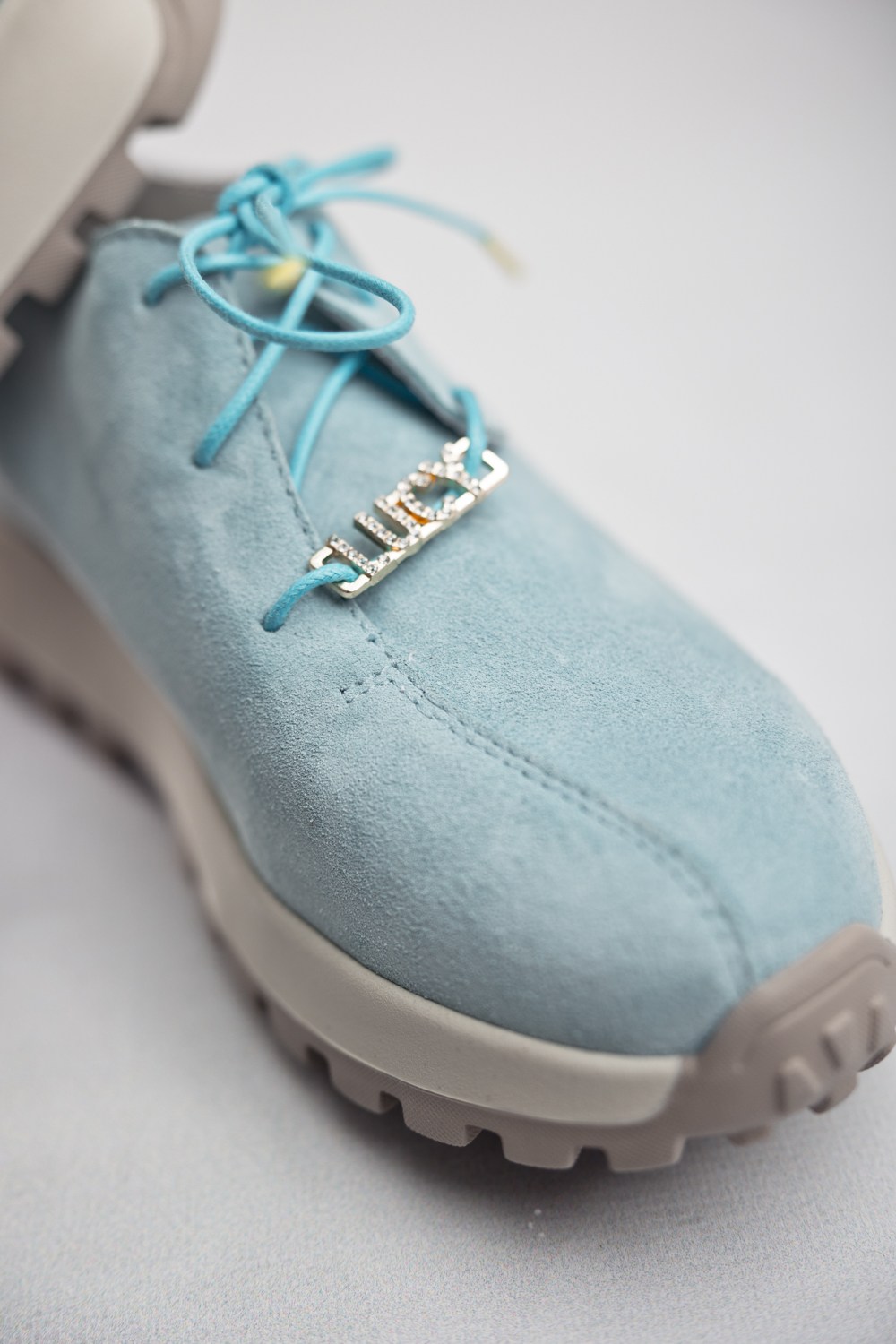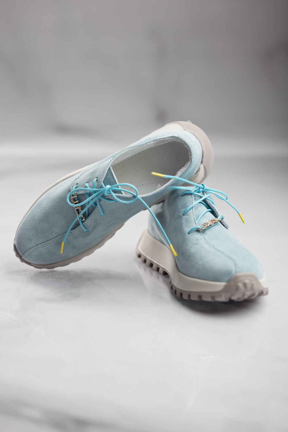 Спортно-елегантни обувки в светло синьо от мек велур с лого на марката и сини връзки.