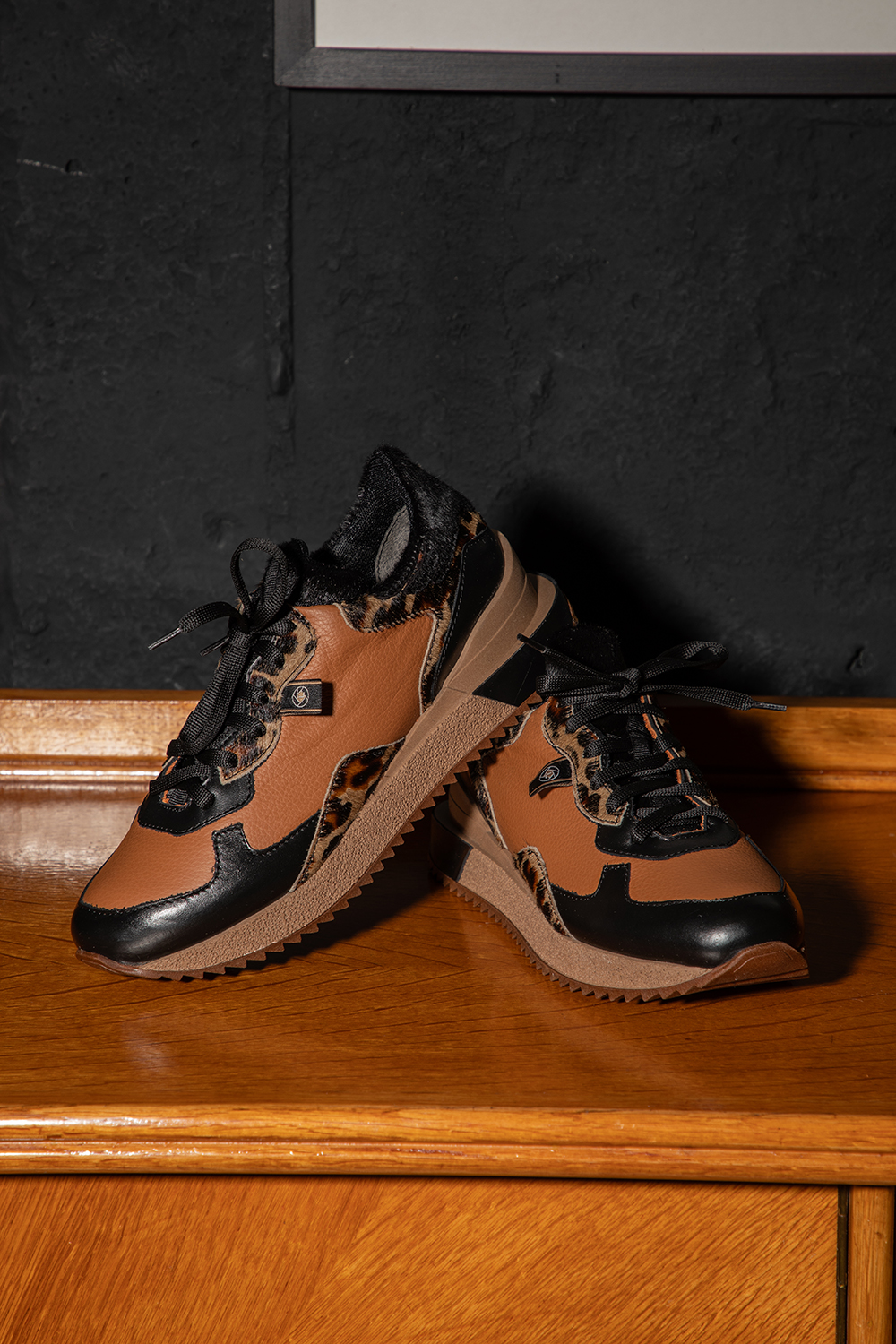 Спортни обувки от 100% естествена кожа. Актуален дизайн в свежа цветова комбинация в коняк, черно и леопардов принт.