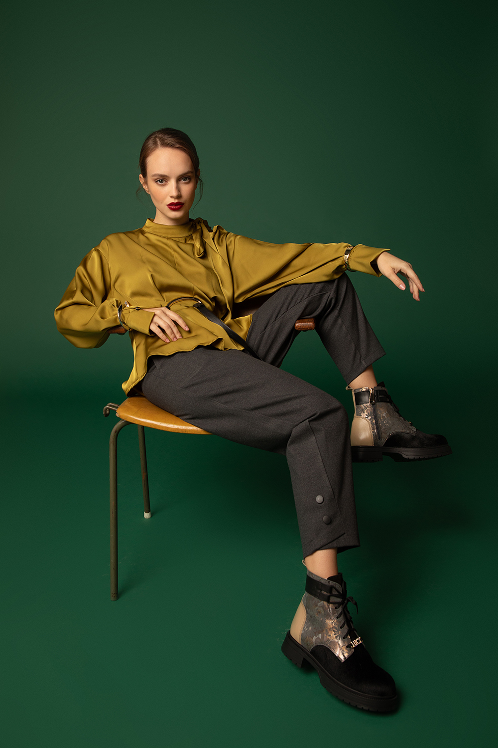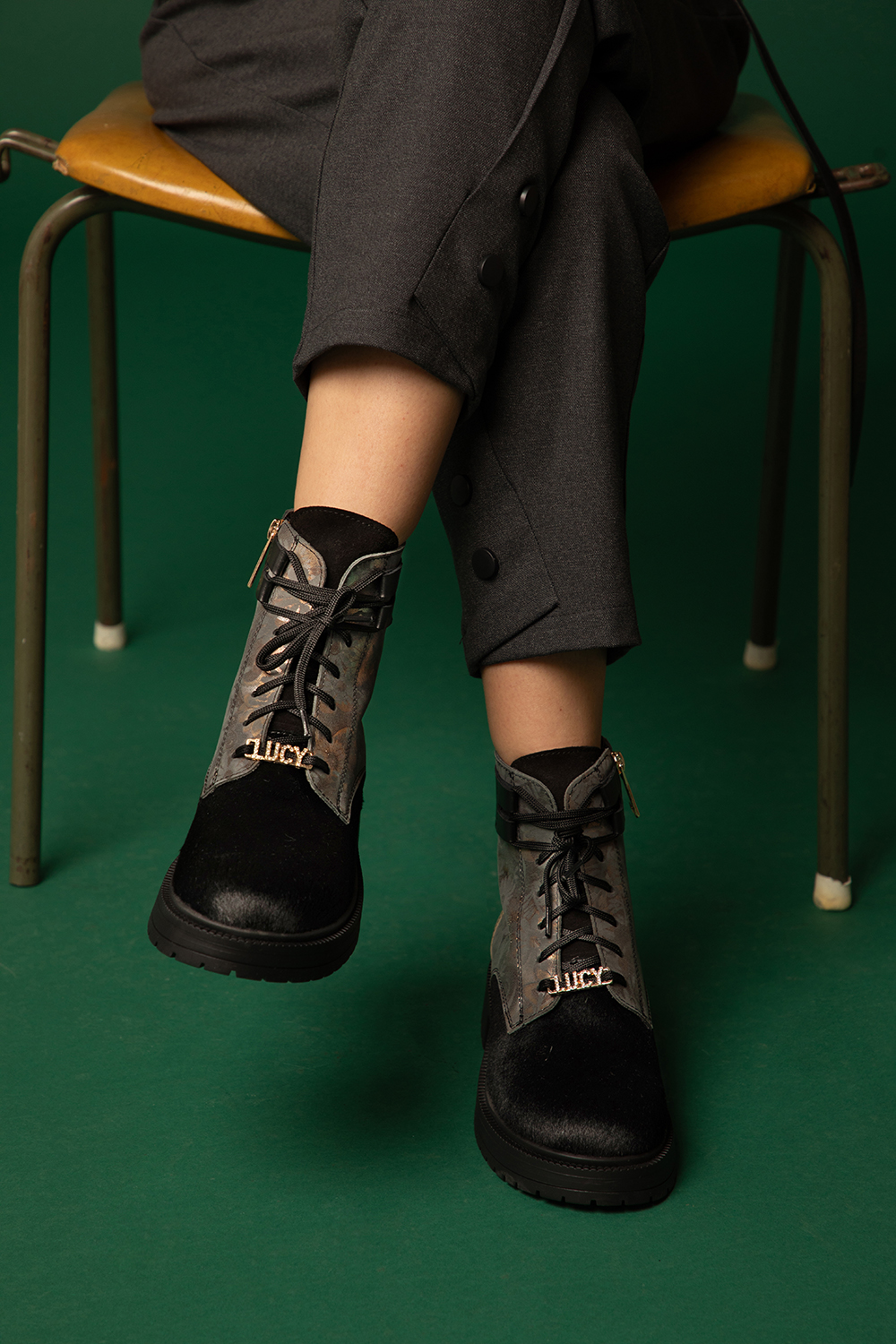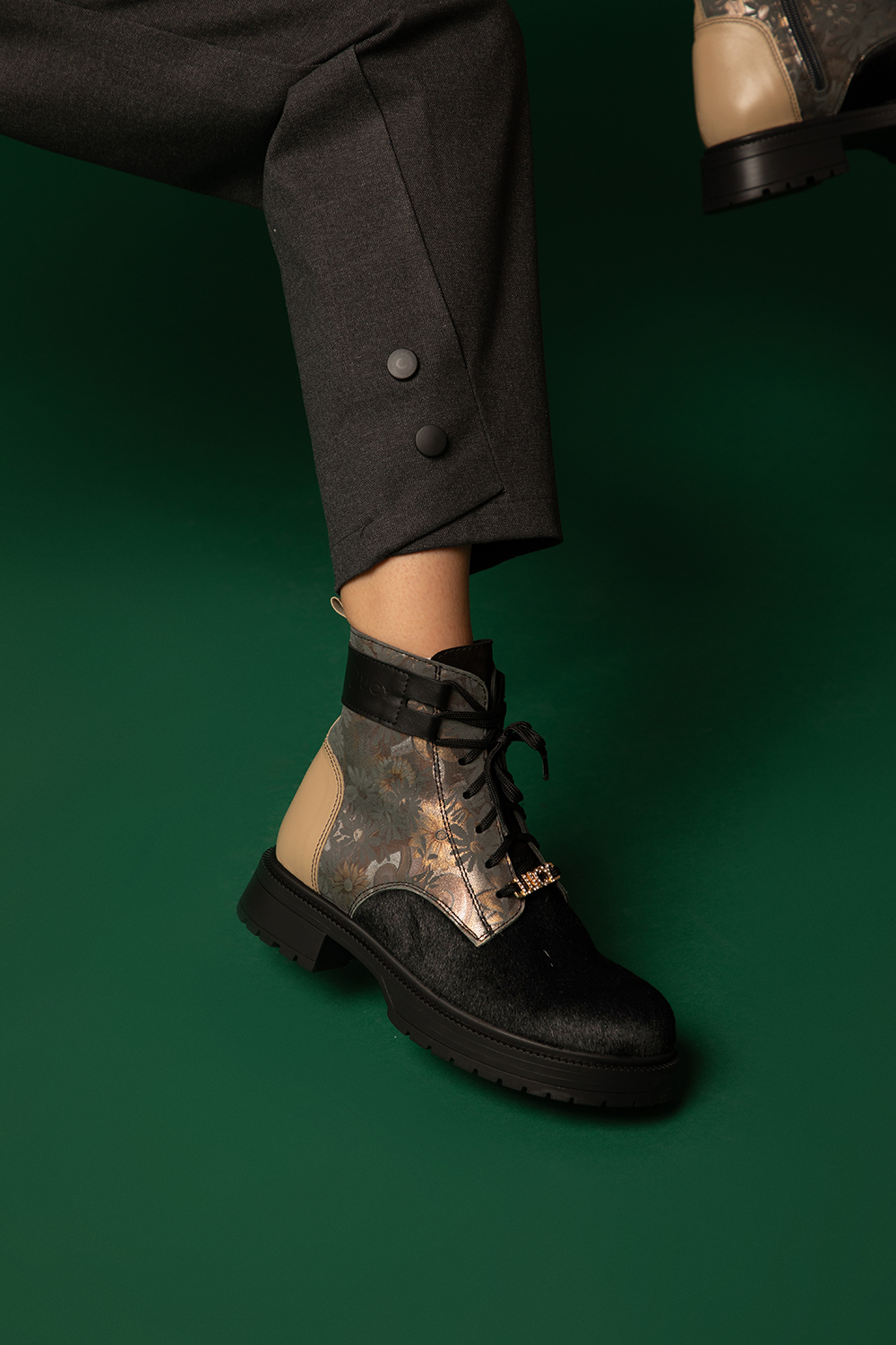 Елегантни боти от черно пони с акцент флорален принт в сиво. Закопчаване посредством страничен цип и връзки отпред с комфортна подметка.