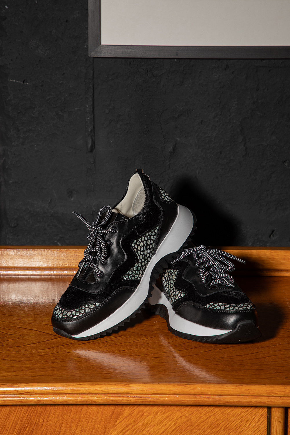 Спортни обувки от 100% естествена кожа. Актуален дизайн в черно и светло сиво с дискретен блясък. Комфортна подметка и интересна комбинация от материали.