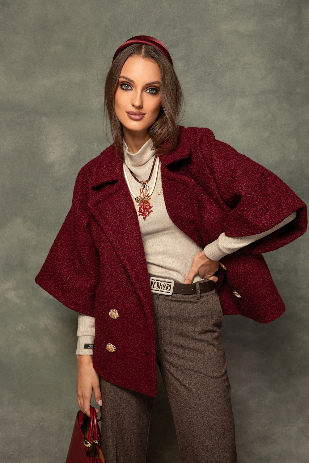 Ефектно палто от букле с високо съдържание на вълна във вишнево. Свободен силует с двуредно закопчаване и ревер. 7/8 ръкав камбанка и предни джобове. Палтото е подплатено със сатенирана подплата в екрю.