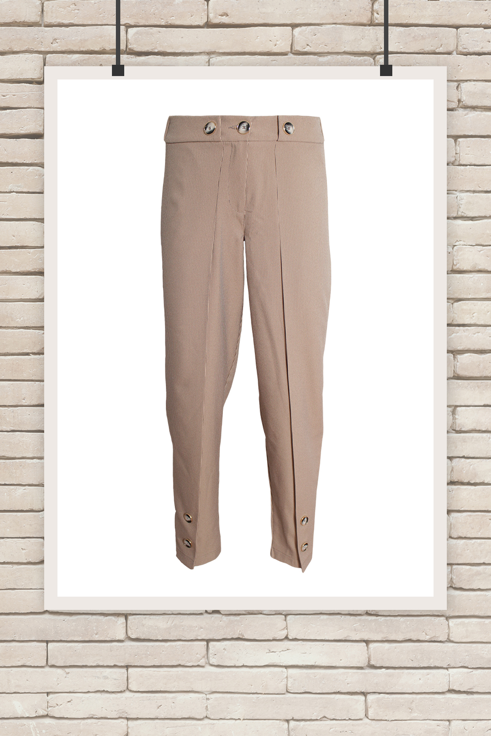 Спортно-елегантен панталон от приятна еластична материя в цвят капучино в десен ситно райе. Леко свободен силует с интересни детайли - копчета на колана, плохи и копчта на крачола. Колан ластик в задната част на талията.