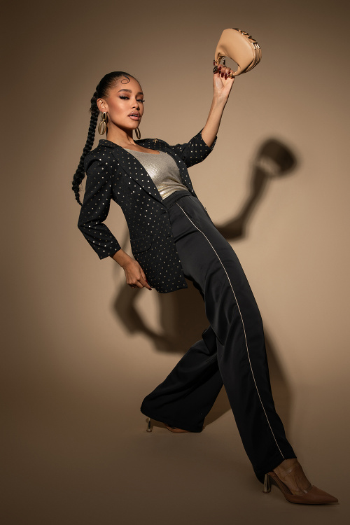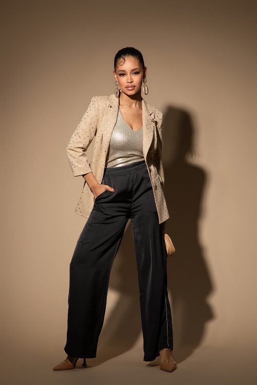 Елегантен панталон от приятна материя в черно. Свободен силует с широк крачол и тънък кант встрани. Два джоба и колан-ластик за по-голям комфорт.
