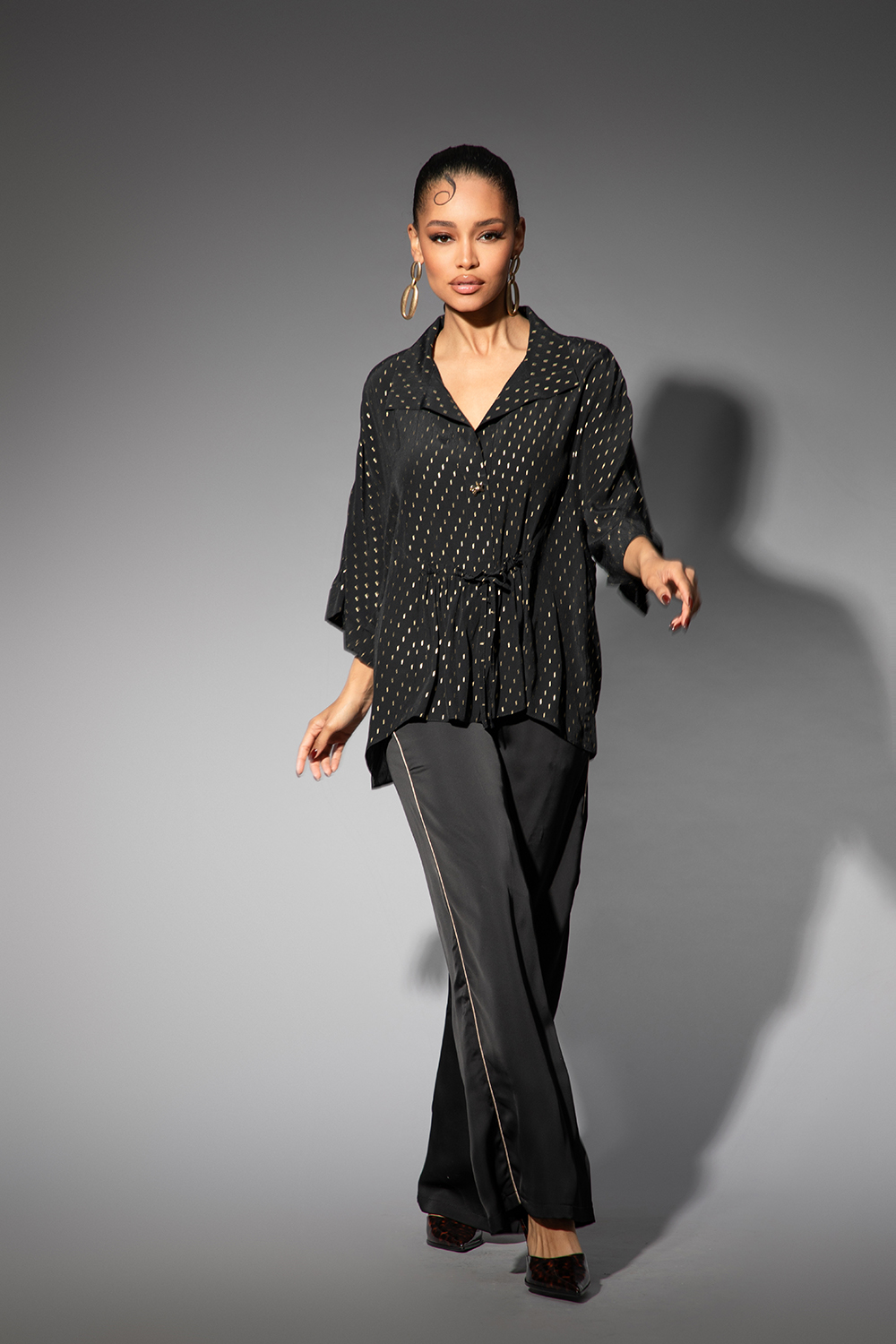 Елегантен панталон от приятна материя в черно. Свободен силует с широк крачол и тънък кант встрани. Два джоба и колан-ластик за по-голям комфорт.