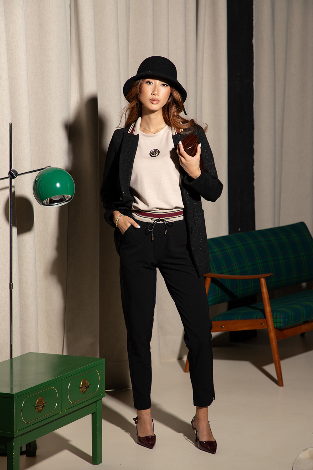 Спортно-елегантен панталон от стегната еластична материя в черно. Леко втален силует с колан ластик от цветен щрик с връзка и странични джобове.