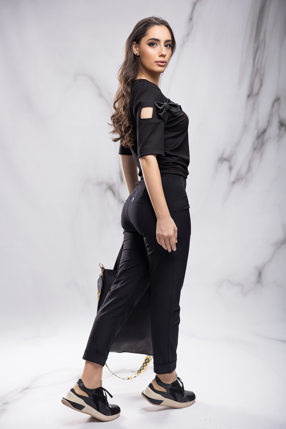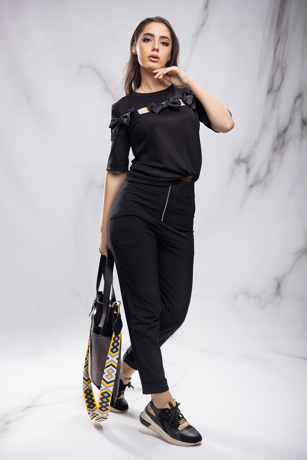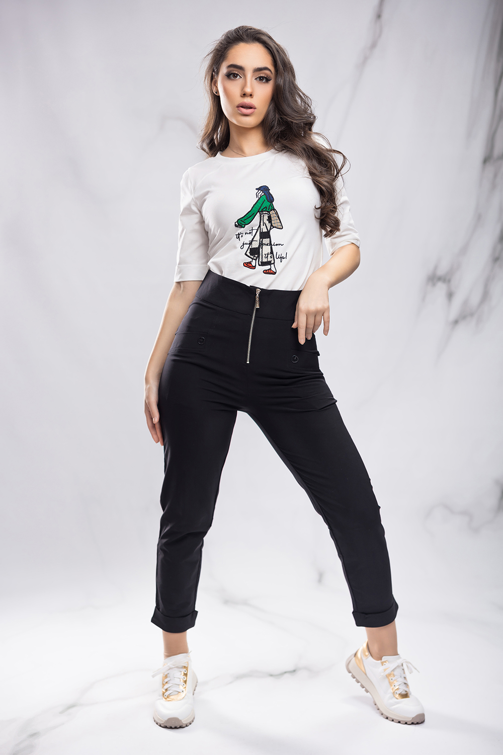 Спортно-елегантен панталон от приятна силно еластична материя в черно. Втален силует с висока талия и предно закопчаване посредством метален цип. Предни джобове с филетки и един външен заден джоб, подвит маншет на крачола.