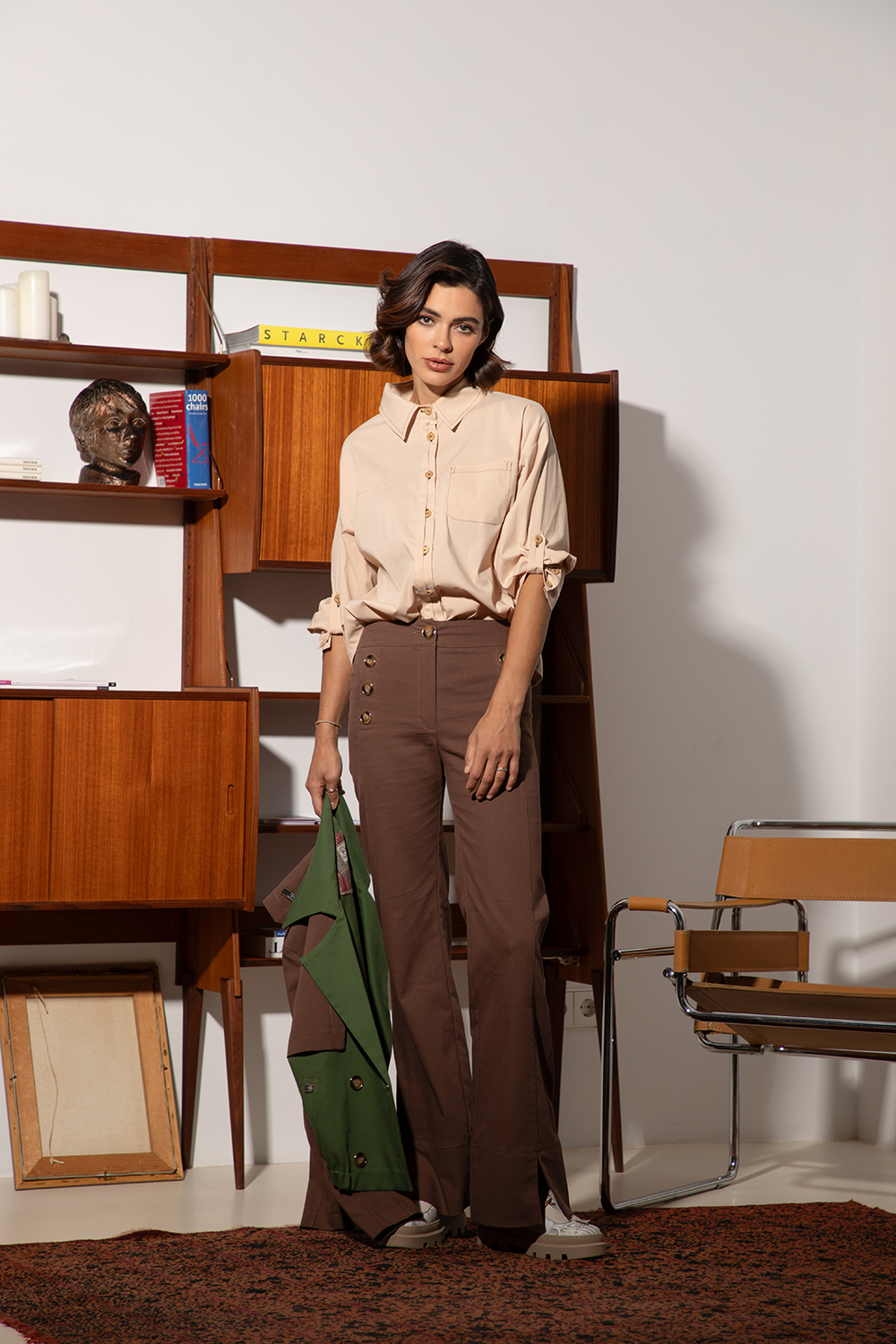 Елегантен панталон от еластична материя с високо съдържание на памук в топло кафяво. Втален силует с широк крачол с малка цепка на маншета. Предно закопчаване посредством цип и копче. Филетки с декоративни копчета в предната част.