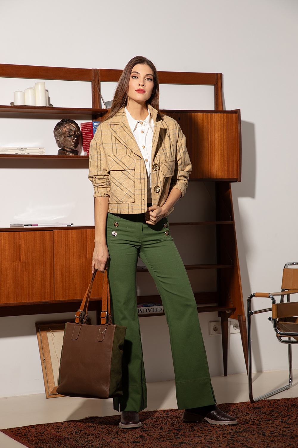 Елегантен панталон от еластична материя с високо съдържание на памук в маслиново зелено. Втален силует с широк крачол с малка цепка на маншета. Предно закопчаване посредством цип и копче. Филетки с декоративни копчета в предната част.