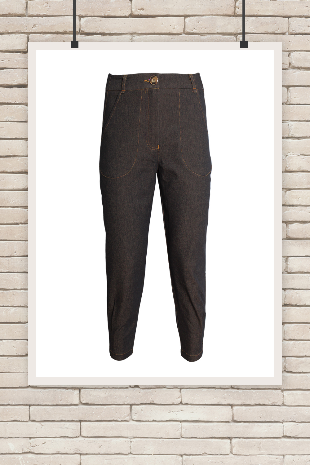 Спортно-елегантен панталон от еластичен деним с високо съдържание на памук в тъмено индиго с кафяв оттенък. Леко свободен силует с предни и задни джобове. Колан ластик в задната част и гайки. Закопчаване посредством цип и копче.