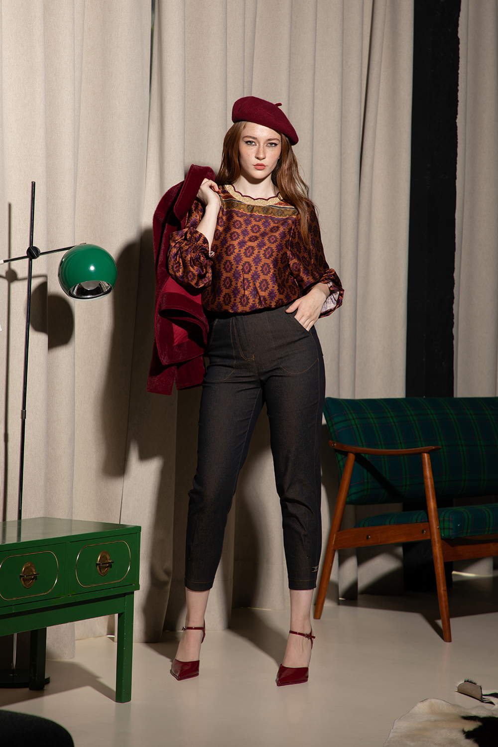 Спортно-елегантен панталон от еластичен деним с високо съдържание на памук в тъмено индиго с кафяв оттенък. Леко свободен силует с предни и задни джобове. Колан ластик в задната част и гайки. Закопчаване посредством цип и копче.