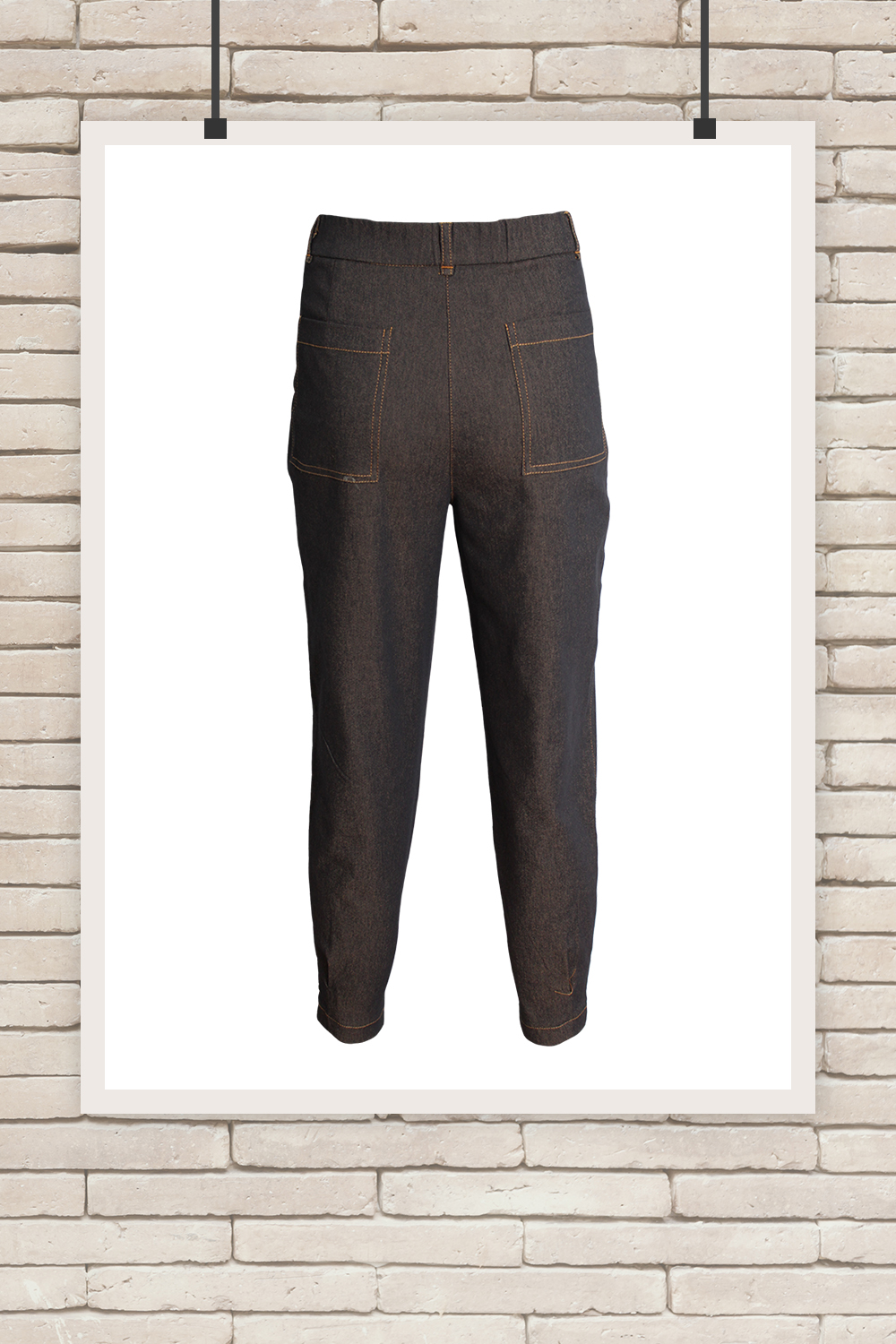 Спортно-елегантен панталон от еластичен деним с високо съдържание на памук в тъмено индиго с кафяв оттенък. Леко свободен силует с предни и задни джобове. Колан ластик в задната част и гайки. Закопчаване посредством цип и копче.