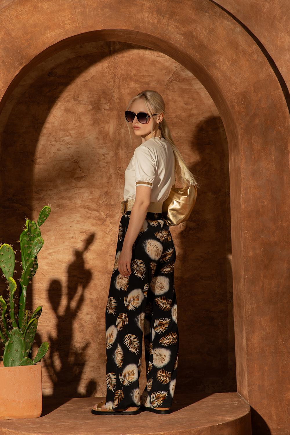 Спортно -елегантен панталон от лека вискоза с ефектен авторски принт. Свободен силует с широк крачол. Колан ластик в талията и джобове.