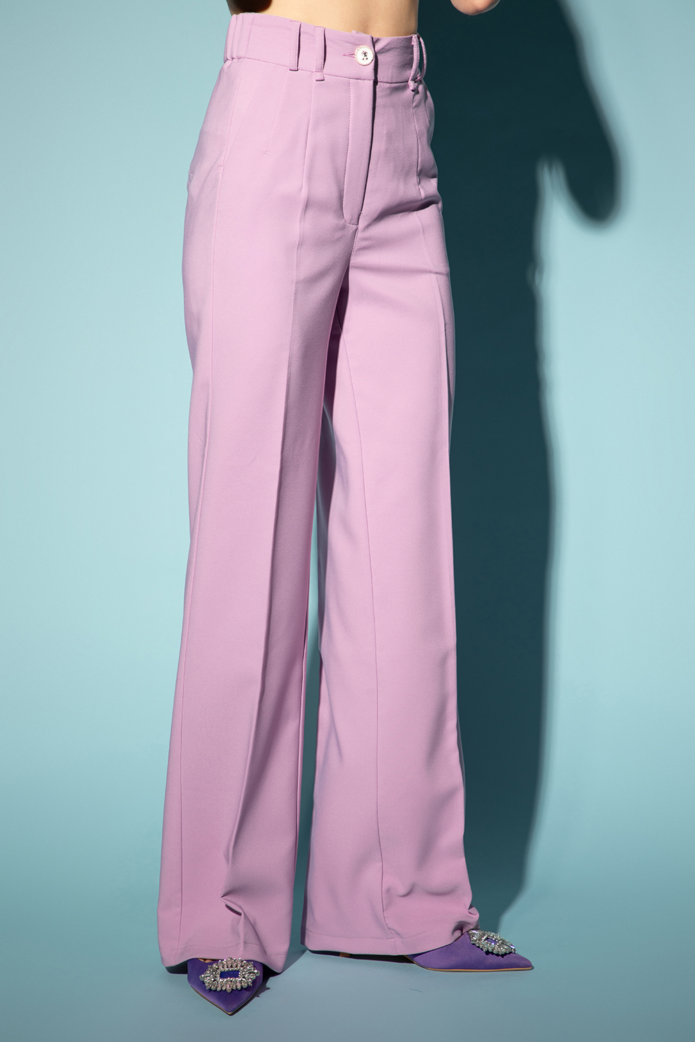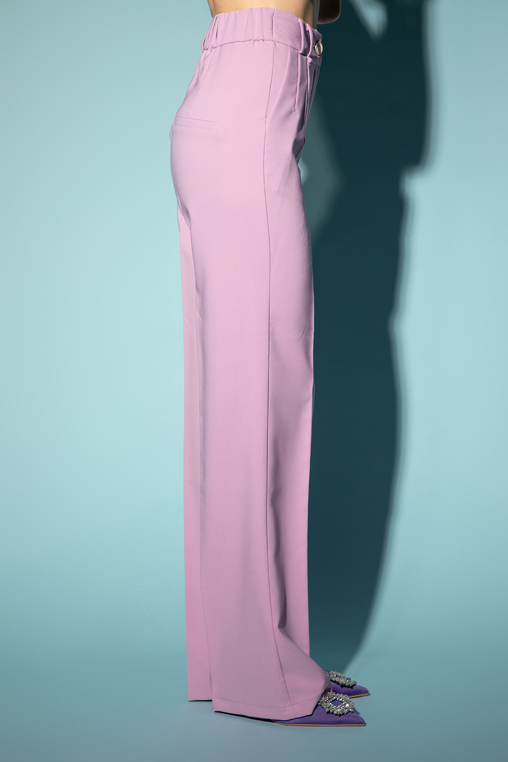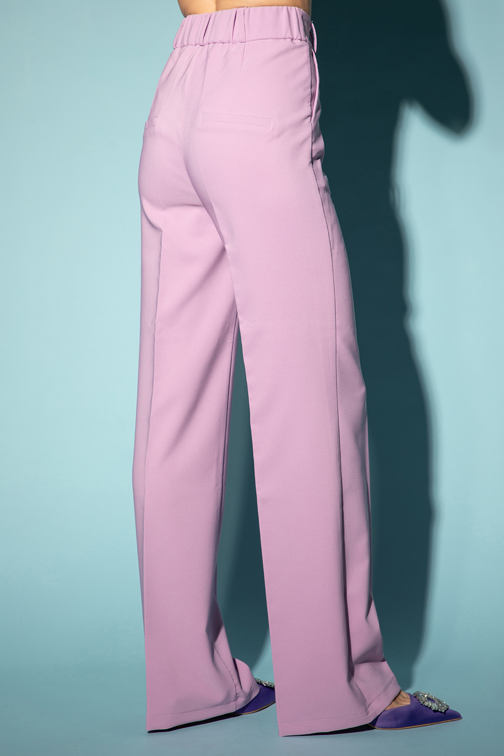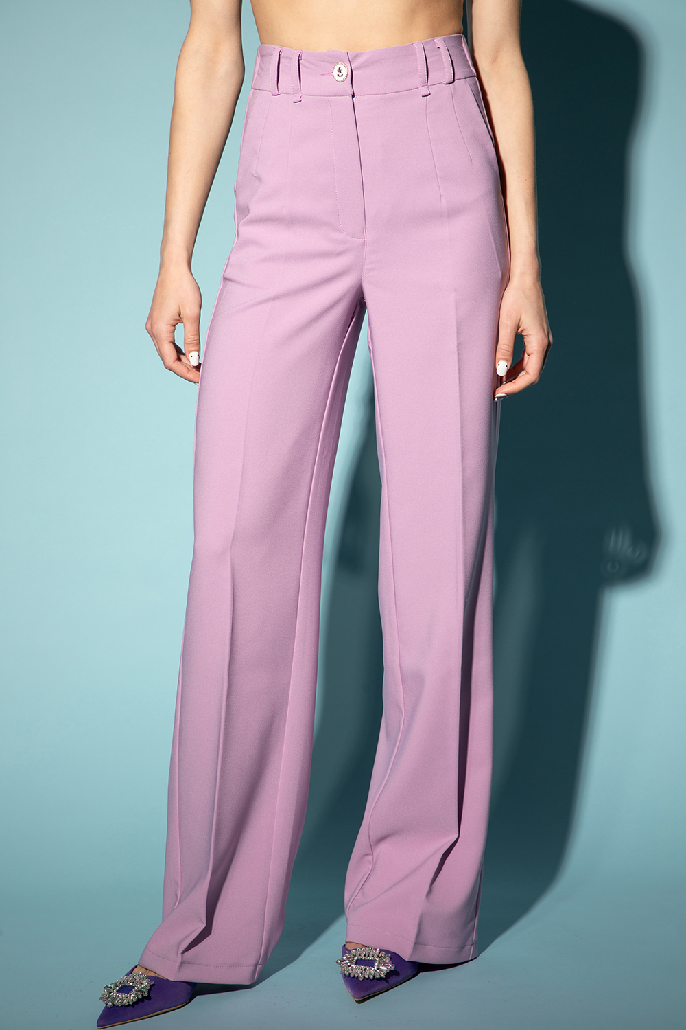 Елегантен панталон от приятна еластична материя в цвят на свежа лавандула. Леко свободен силует и широк крачол. Странични джобове, ластик в задната част и гайки за колан. Предно закопчаване посредством цип и копче.