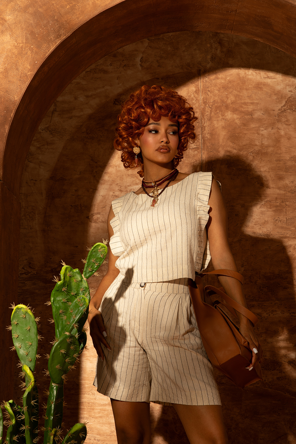 Къс панталон от лека материя смес от лен и вискоза в натурално екрю с тъмно райе и дискретна златиста нишка. Леко свободен силует с широк колан с ластик на гърба. Предни джобове и закопчаване посредством цип и две копчета.
